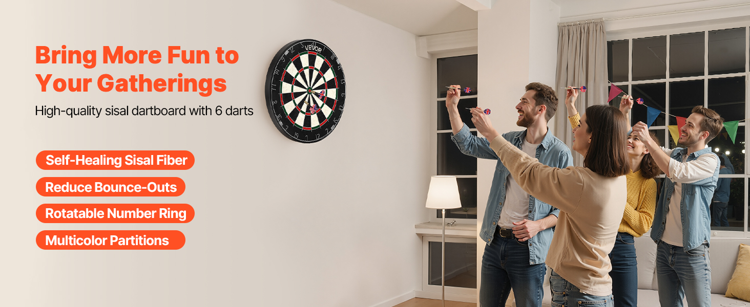 ألياف السيزال ذاتية المعالجة: مصنوعة من ألياف السيزال الفاخرة، لوحة رمي السهام VEVOR هذه تشفى ذاتيًا بعد كل رمية، وتقاوم الاهتراء والتساقط، وتوفر حملاً ثابتًا للسهام من أجل رميات دقيقة ولعب طويل الأمد. استمتع بالألعاب الممتعة واللعب التفاعلي مع العائلة والأصدقاء