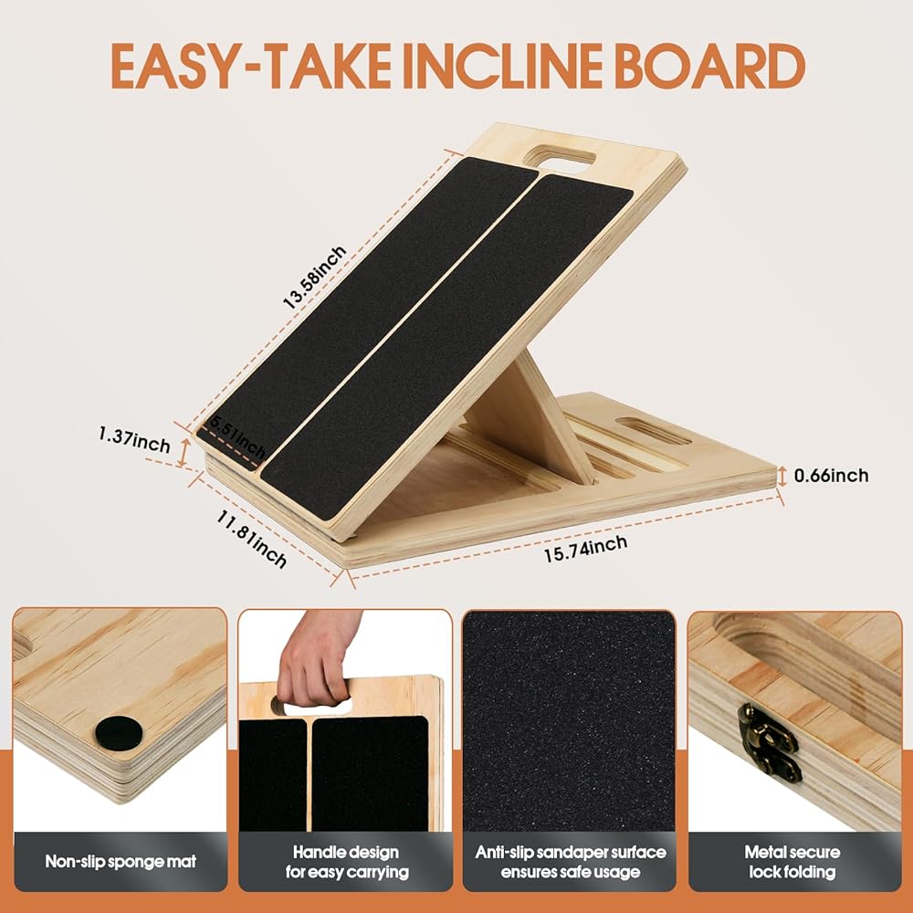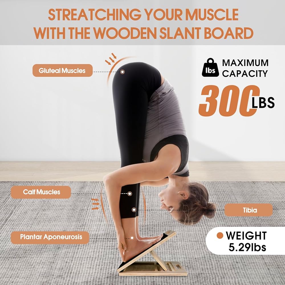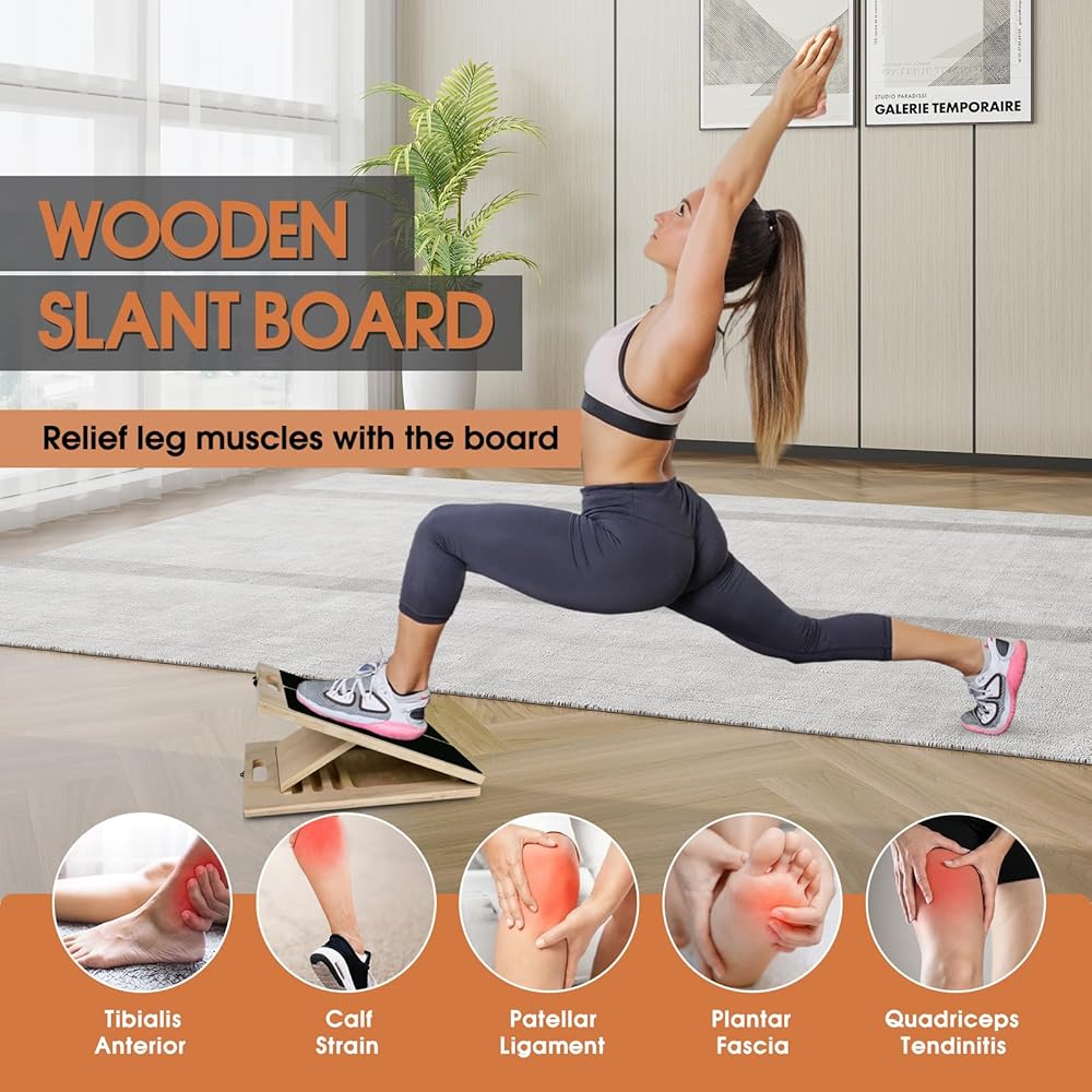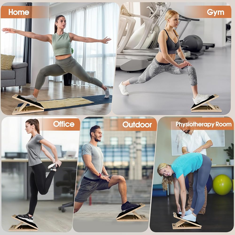 • لوح مائل بزوايا قابلة للتعديل بخمسة مستويات: مصنوع من خشب عالي الجودة، ويتميز اللوح بخمس زوايا قابلة للتعديل، لاستيعاب مستويات الكثافة المختلفة للمستخدمين. قم بتحسين القوة والمرونة والتوازن والحركة تدريجيًا من خلال إجراءات التمدد المخصصة. يمكن أن يساعدك ذلك على إبقاء الأذى بعيدًا عن آلام الساق والكاحل والورك وإصابات الساق.