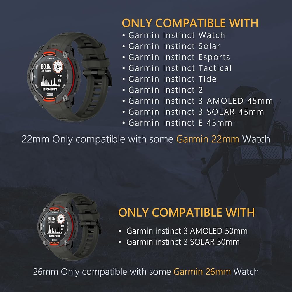 الطراز المتوافق: مقاس 26 مم متوافق فقط مع سوار Garmin Instint 3 مقاس 50 مم. يناسب المعصم مقاس 5.5 بوصة - 8.7 بوصة (140 مم - 220 مم). يرجى التحقق من طراز وحجم ساعتك بعناية قبل الشراء!