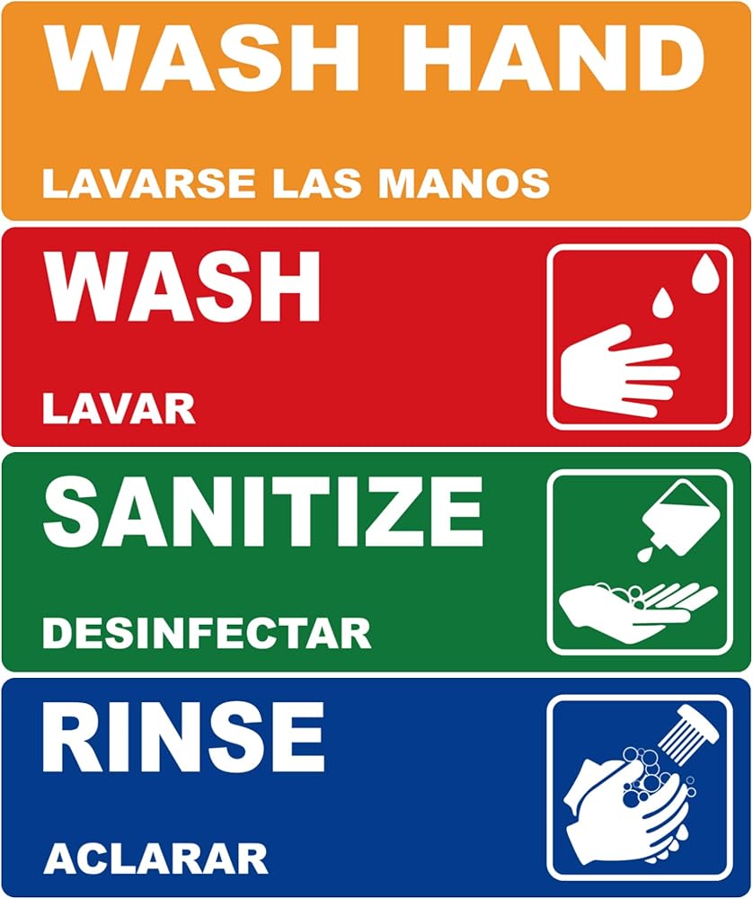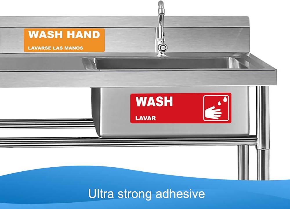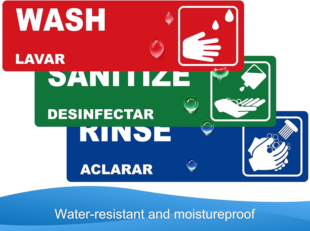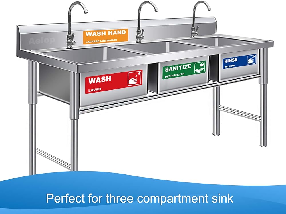 يمكن غسلها، شطف، ملصقات بالوعة غسيل يدوي، لافتات ملصقات مقاومة للماء شديدة التحمل لـ 3 مغسلة مقصورة، مطاعم، مطابخ تجارية، شاحنات طعام، غسيل الأطباق أو محطة غسل، 6.6 سم × 22.6 سم