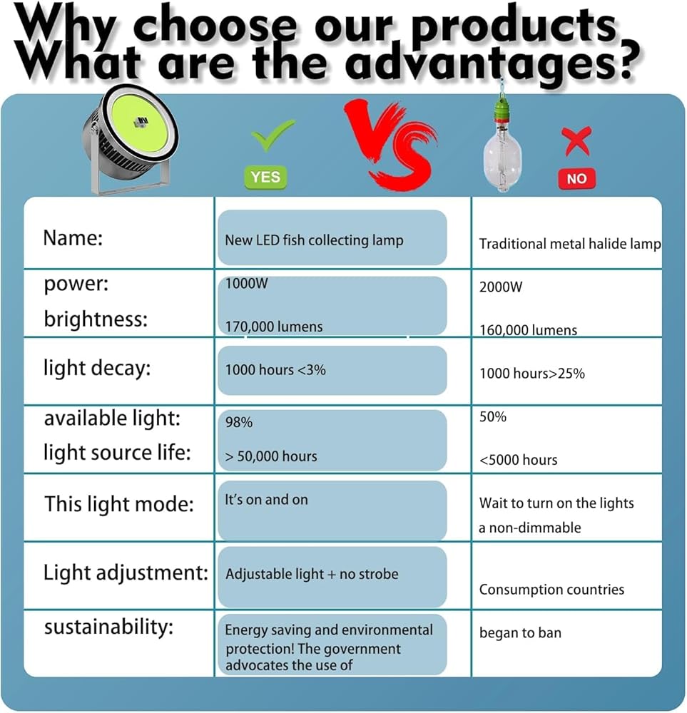 اختراق محسّن للمياه العميقة - يتميز بمخرج طيفي مضبوط بدقة، حيث ينتقل الضوء إلى عمق عمود الماء، مما يحفز تجميع الأسماك ويحسن بشكل كبير معدلات الصيد للاستخدام التجاري والترفيهي.