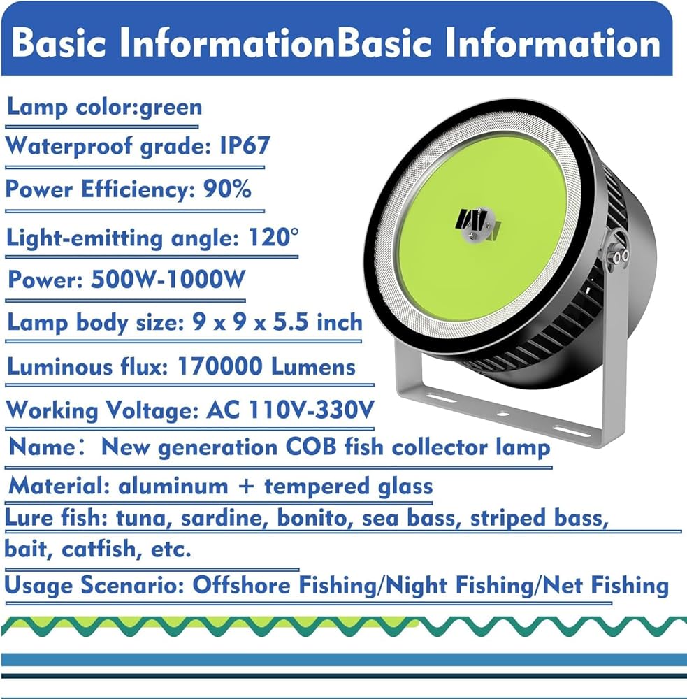مخرج LED قوي 500 وات - 1000 وات - تم تصميمها باستخدام تقنية بصرية متقدمة، توفر مصابيح الصيد LED عالية الكثافة هذه سطوعًا واختراقًا استثنائيين، وتجذب الحياة البحرية بشكل فعال مع ضمان كفاءة الطاقة.