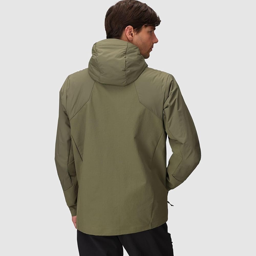 The Men's Shadow Hybrid Hoodie is built to perform as a versatile mid layer in high-output alpine, trail, or tactical conditions where breathability, stretch, and lightweight insulation matter most. This men's zip up jacket combines VerticalX Eco insulation at the front body and hood with a breathable fleece-lined stretch woven fabric at the sides and back, offering targeted warmth and moisture management exactly where you need it. The 4-way stretch construction and movement mirroring design let you move freely under a pack or harness, while a DWR treatment adds water resistance for unpredictable weather. Features include an insulated hood, bonded articulated cuffs with gussets, an external chest pocket, and dual hand pockets for essential storage. Whether you're layering it under a shell or wearing it as your go-to outdoor jacket on the move, the Shadow Hybrid delivers the technical comfort and warmth of a performance mid-layer in the familiar feel of a hoodie jacket. Ideal for anyone seeking a zip hoodie that stands up to alpine missions, snowy trails, or cool-weather tactical pursuits.