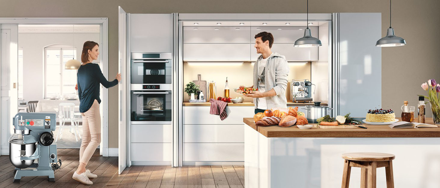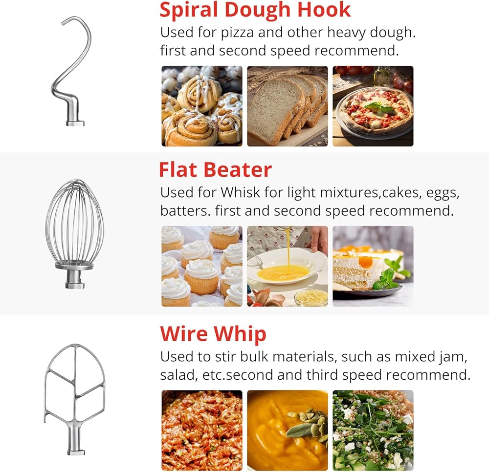 ثلاث ملحقات قابلة للاستبدال: خلاط المطبخ يحتوي على 3 ملحقات، خطاف العجين الحلزوني: يستخدم للبيتزا وغيرها من العجين الثقيل. المضرب المسطح: يستخدم لخفق الخلطات الخفيفة والكعك والبيض والخفافيش. السوط السلكي: يستخدم لتحريك المواد السائبة مثل المربى والسلطة