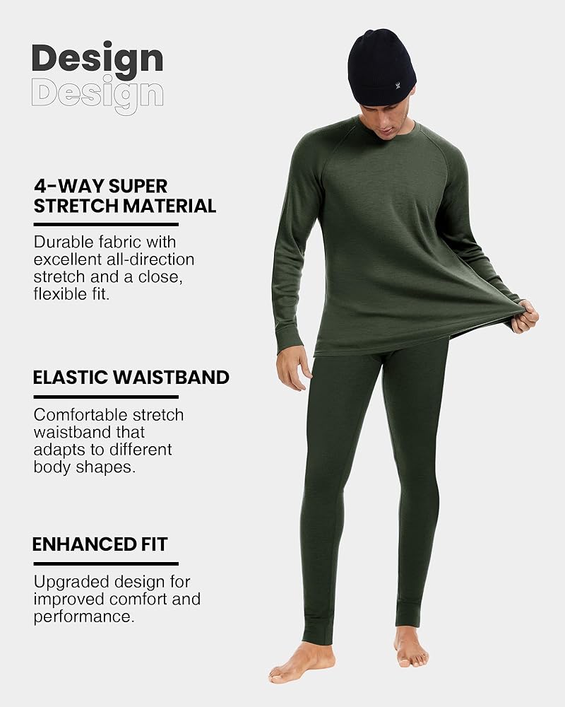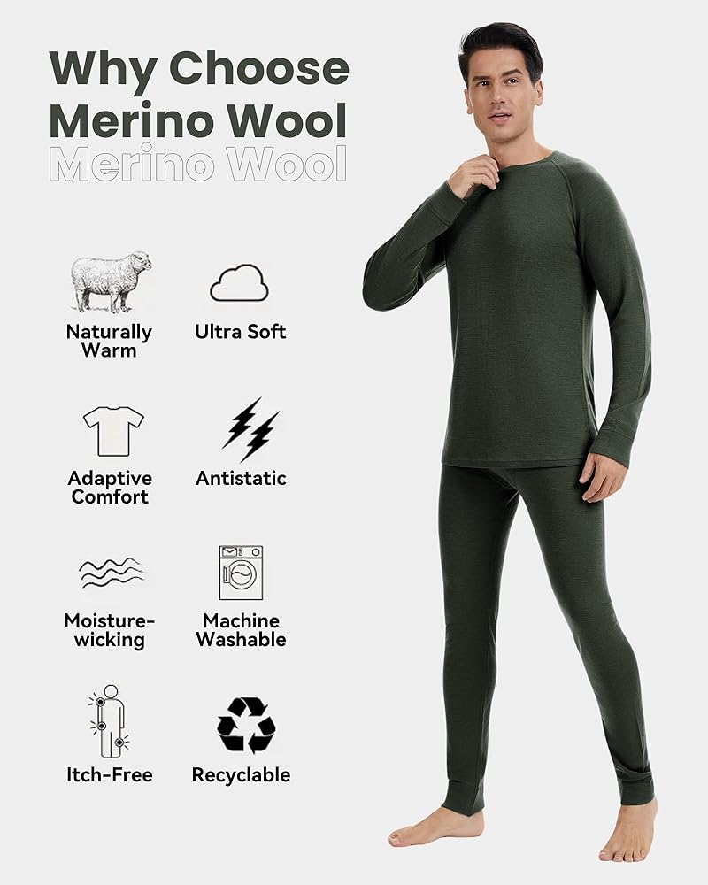 ناعم وخالي من الحكة: يحتوي صوف ميرينو على ألياف أرق وأدق مما يجعله ناعم الملمس ولا يسبب أي تهيج للجلد، مما يجعله خيارًا رائعًا للارتداء اليومي كملابس داخلية حرارية.