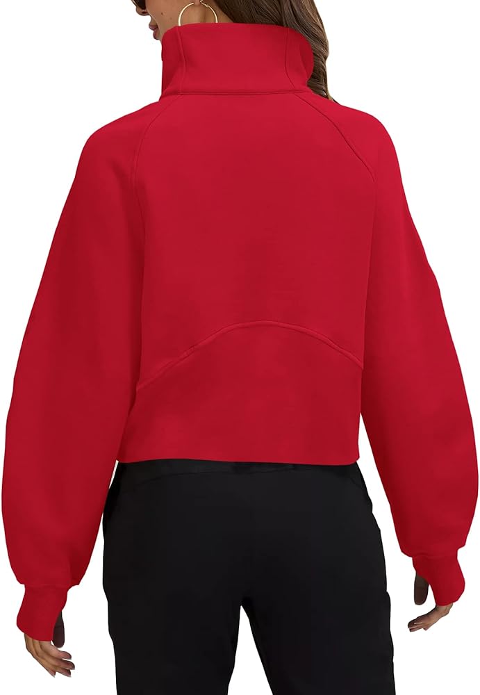 بلوزات نسائية نصف سحاب بلوفر قصير رقبة على شكل قمع صوف مبطن بسحاب وأكمام طويلة فتحة إبهام أحمر