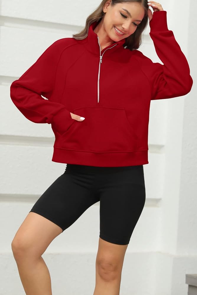 المميزات - سويت شيرت رياضي للتمرين / قمصان بأكمام طويلة للنساء / سويت شيرت بنصف سحاب / أطراف أكمام وحاشية مضلعة / جيوب كنغر / كتف منسدل / فتحة إبهام / نمط فضفاض قصير / قميص قصير للنساء / مقاس مريح / 1/2 ياقة بسحاب / رقبة على شكل قمع نصف سحاب / بلوفر نسائي