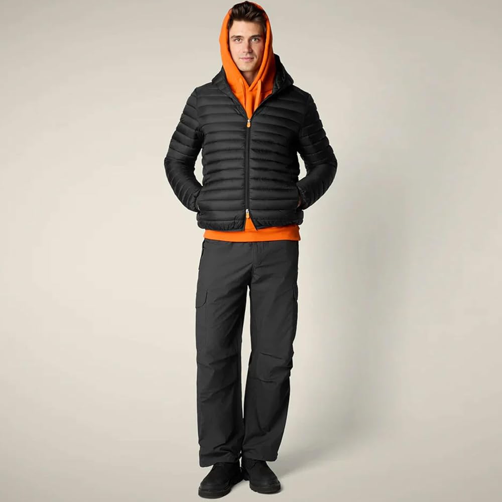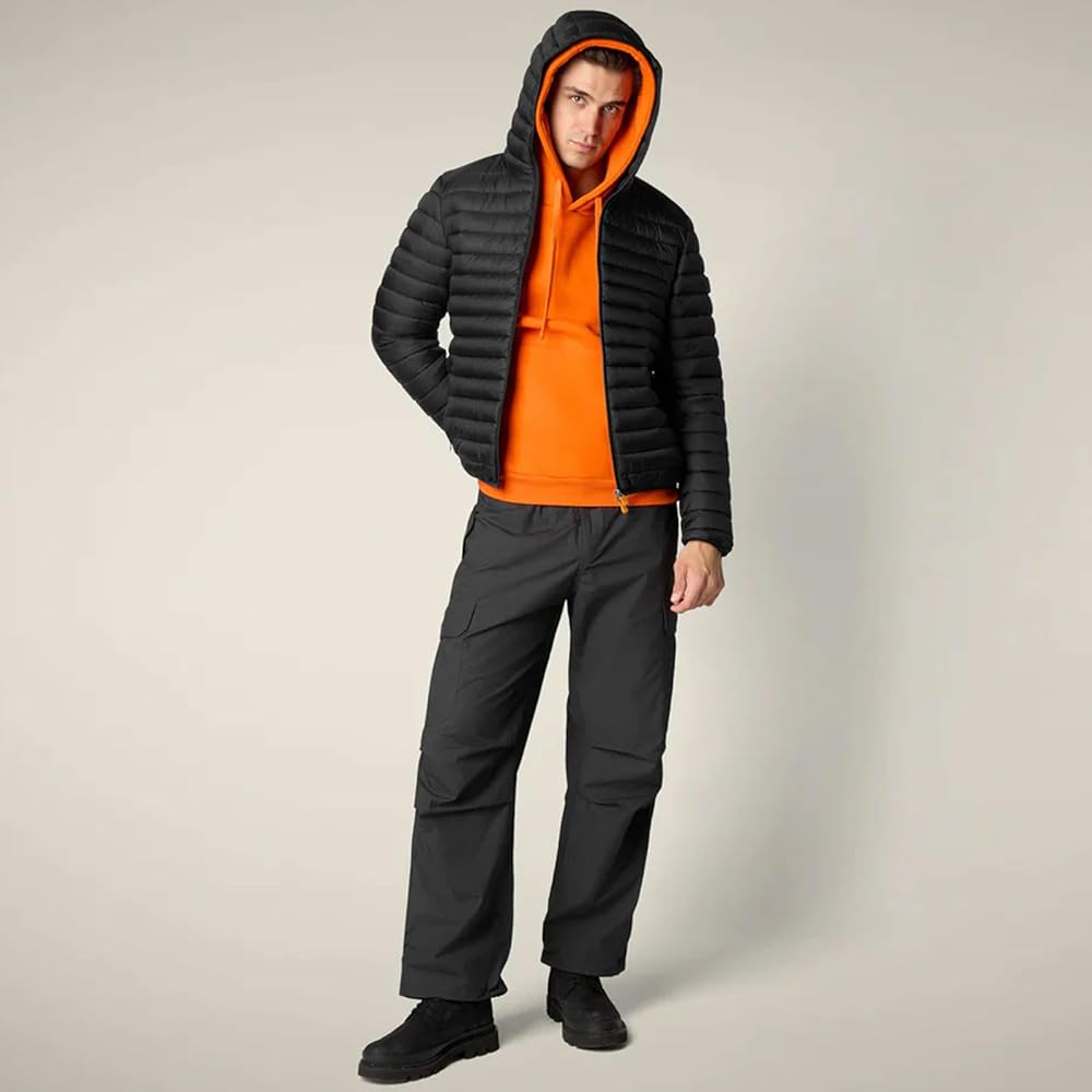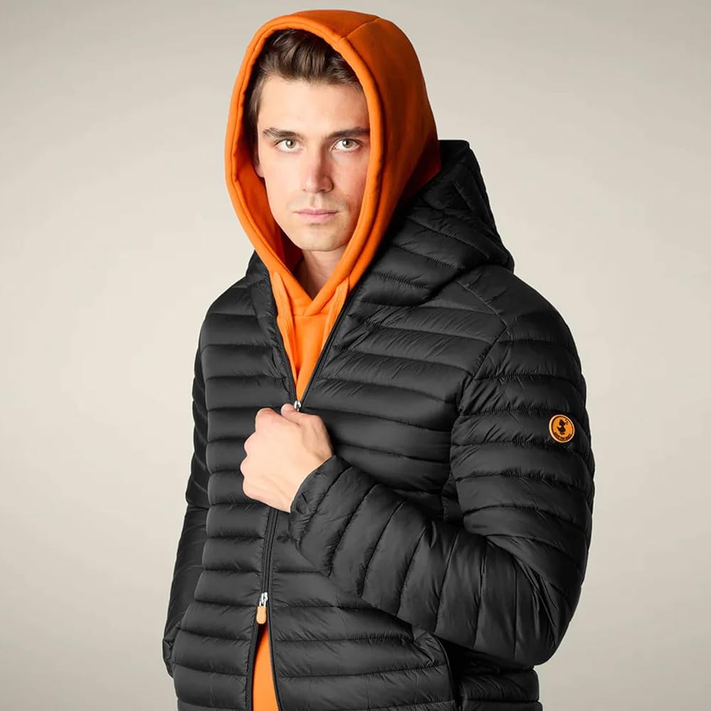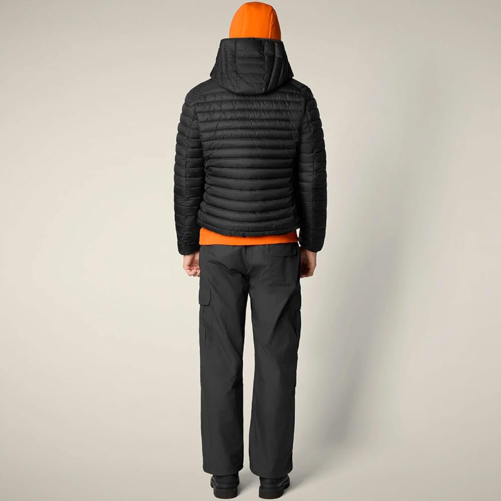 Designed for practicality and style, the Donald jacket features a zip-through hood, in-seam side pockets, and Lycra elasticated cuffs and hem for a snug fit. Signature SAVE THE DUCK details include a rubber logo patch on the sleeve and vibrant orange zip pullers, adding distinctive, fashion-forward accents. Lightweight yet protective, this men's puffer jacket layers easily and is perfect for city streets, commuting, casual outdoor activities, and travel. Elevate your winter wardrobe with a functional, stylish, and sustainable quilted jacket from SAVE THE DUCK.