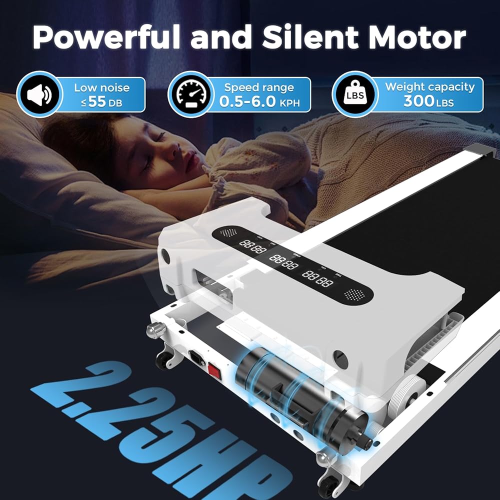 محرك قوي وهادئ: يتميز جهاز المشي هذا بمحرك قوي بقوة 2.25 حصان يوفر لك الطاقة اللازمة للوصول بسهولة إلى سرعات تصل إلى 6 كم/ساعة. وهو يدعم حمولة قصوى تصل إلى 300 رطل.