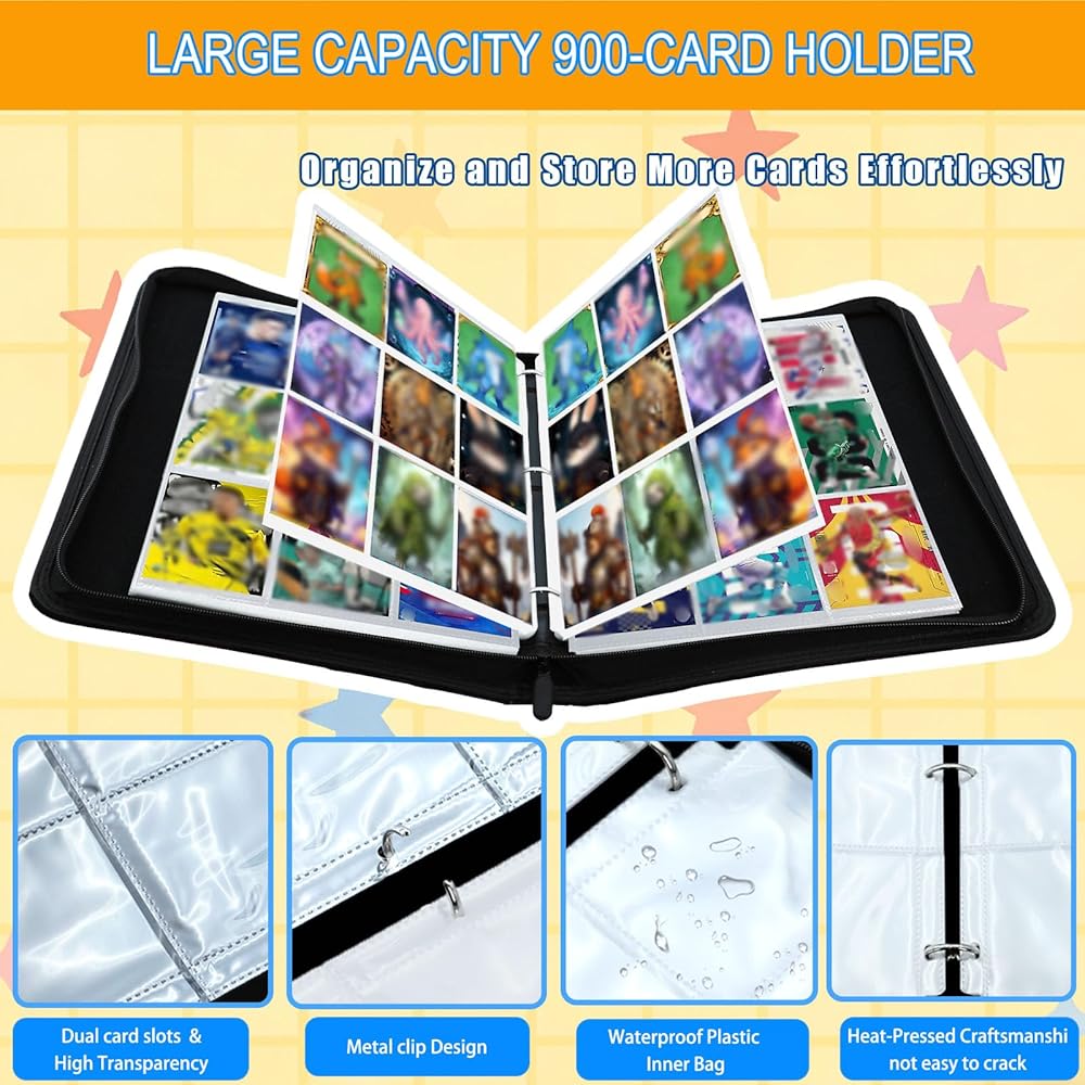 حافظة بطاقات تجارية مكونة من 9 جيوب، حافظة بطاقات مع 50 حافظة قابلة للإزالة، حامل ألبوم بطاقات التداول سعة كبيرة 900 جيب، ألبوم تجميع البطاقات ذو 3 حلقات لـ TCG، الرياضة، بطاقات الألعاب