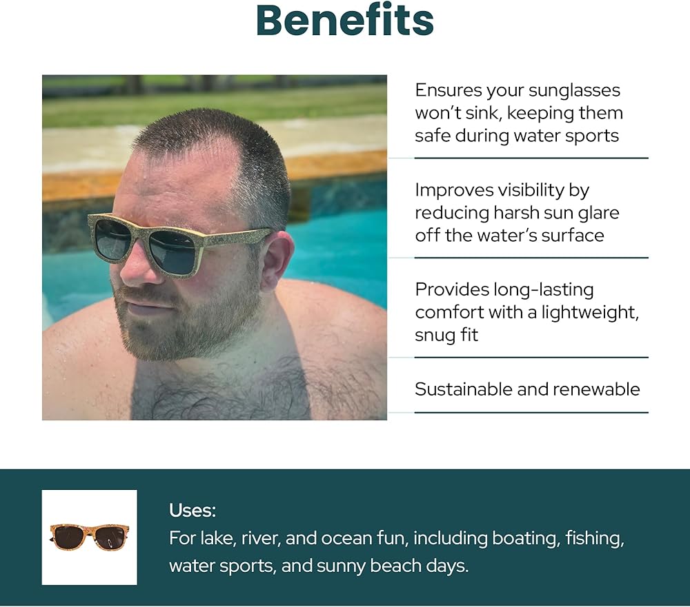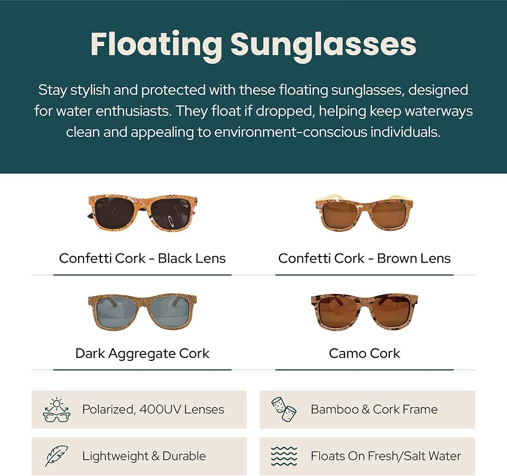 Stay protected and stylish with Texas Cork Company Floating Polarized Sunglasses, engineered for water and outdoor enthusiasts. Built with bamboo frames and cork veneer, these eco-friendly sunglasses are lightweight, durable, and designed to float, so you never lose them in the lake, river, or ocean. The polarized UV400 lenses reduce glare from water and reflective surfaces while blocking harmful UVA/UVB rays, ensuring superior clarity and comfort all day. Perfect for boating, fishing, kayaking, or beach trips, these sunglasses combine safety and performance in one sleek package. Their natural cork finish paired with polarized lenses creates a unique, fashionable look for both men and women. Designed for a snug yet comfortable fit, they're easy to wear for hours without discomfort. Whether you're fishing, relaxing by the water, or enjoying a summer hike, these floating polarized sunglasses deliver the perfect balance of protection, style, and reliability for any adventure.