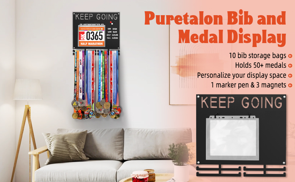 عرض ميدالية السباق مريلة حديدية شديدة التحمل وعرض ميدالية للعدائين تحمل أكثر من 50 ميدالية ومرايل سباق حامل ميدالية ماراثون تتضمن 10 أكياس تخزين مريلة و1 قلم تحديد قابل للغسل و3 مغناطيسات