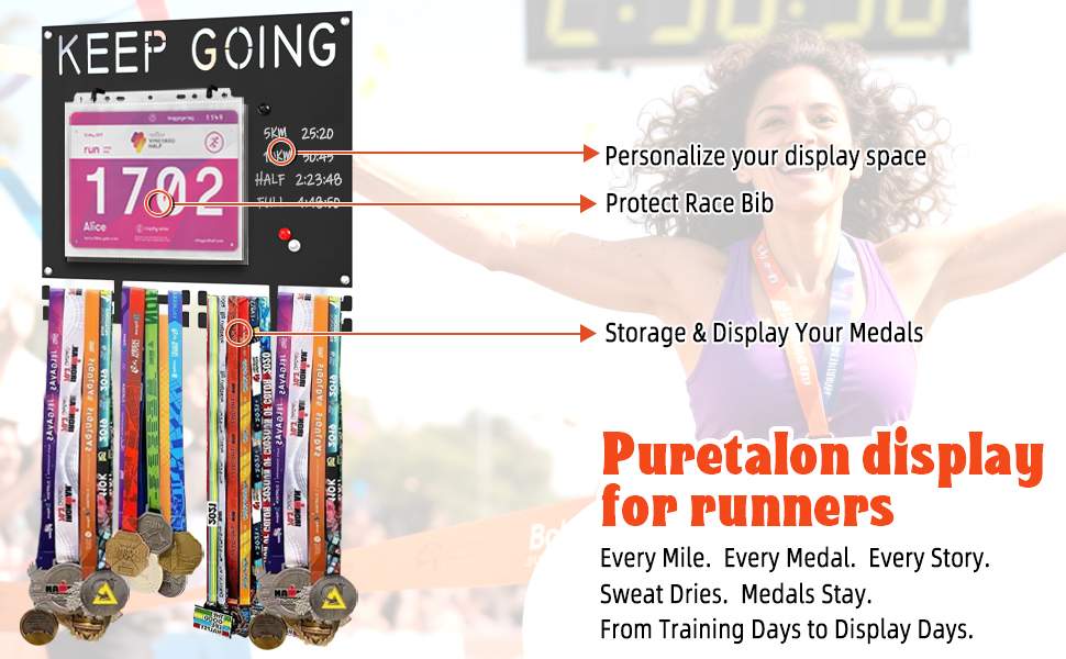 هيكل حديد عالي التحمل لمتانة دائمة - عرض ميدالية ماراثون بيورتالون مصنوع من حديد بسمك 2 مم مع طلاء أسود أنيق، تم تصميم عرض ميدالية السباق هذا ليدوم طويلاً. تحمل أكثر من 50 ميدالية وأكثر من 50 مريلة سباق ليس من السهل تشويهها - مثالية للعدائين المتفانين وعداءي الماراثون.