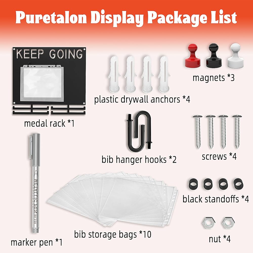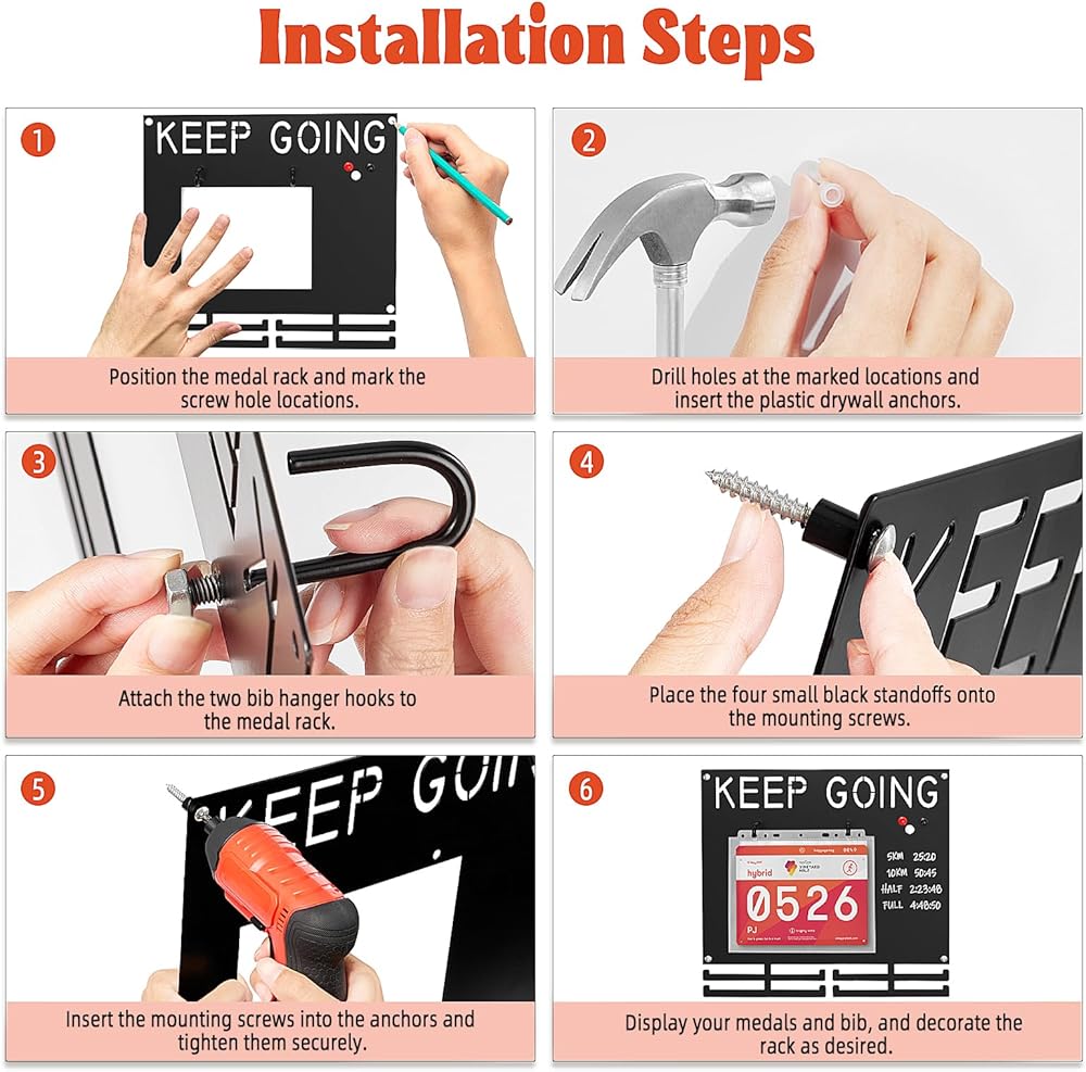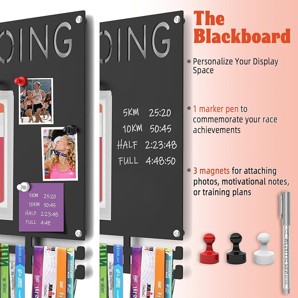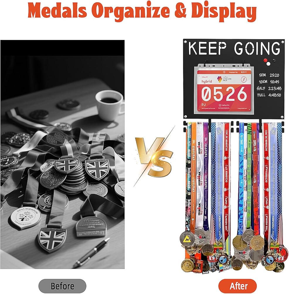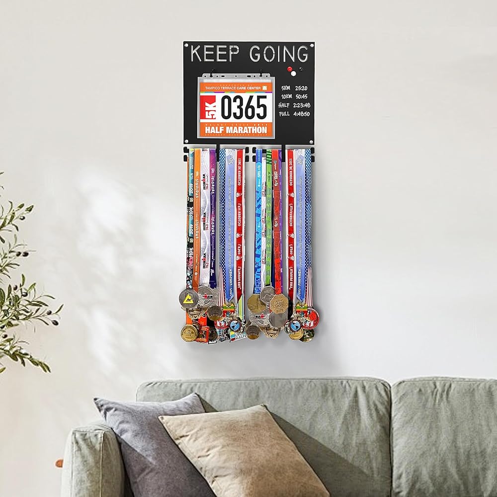 اعرض بفخر إنجازاتك التي حصلت عليها بشق الأنفس - حامل ميدالية الماراثون مصمم للعدائين الذين يعتزون برحلتهم. اعرض كل خط نهاية بكل فخر، بدءًا من مسافة 5 كيلومترات وحتى سباقات الماراثون الفائقة! على عكس شاشات شماعات الميداليات البلاستيكية أو الخشبية الرخيصة، فإن عرض ميداليات الجري الحديدي هذا لن ينحني أو يتشقق، حتى عند تحميله بميداليات ثقيلة.