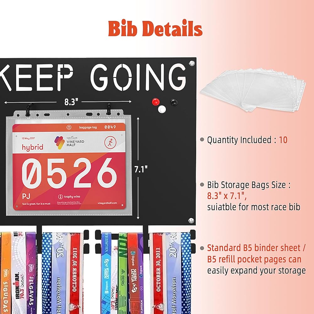 منظمة الكل في واحد للمرايل والميداليات والذكريات - عرض المريلة والميداليات النهائي للعدائين! تتضمن 10 أكياس تخزين مريلة قابلة لإعادة الاستخدام (تناسب حشوات B5 القياسية) و3 مغناطيسات لإرفاق صور السباق أو بولارويد أو الملاحظات التحفيزية.