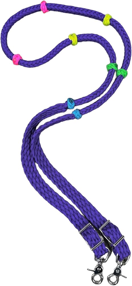 This is a pair of 6' hand braided purple reins made from the finest 550 nylon commercial paracord. They are made from 8 strands of paracord . They can be adjusted shorter with the conway buckles. The colored knots make it much easier to have the correct hand placement
