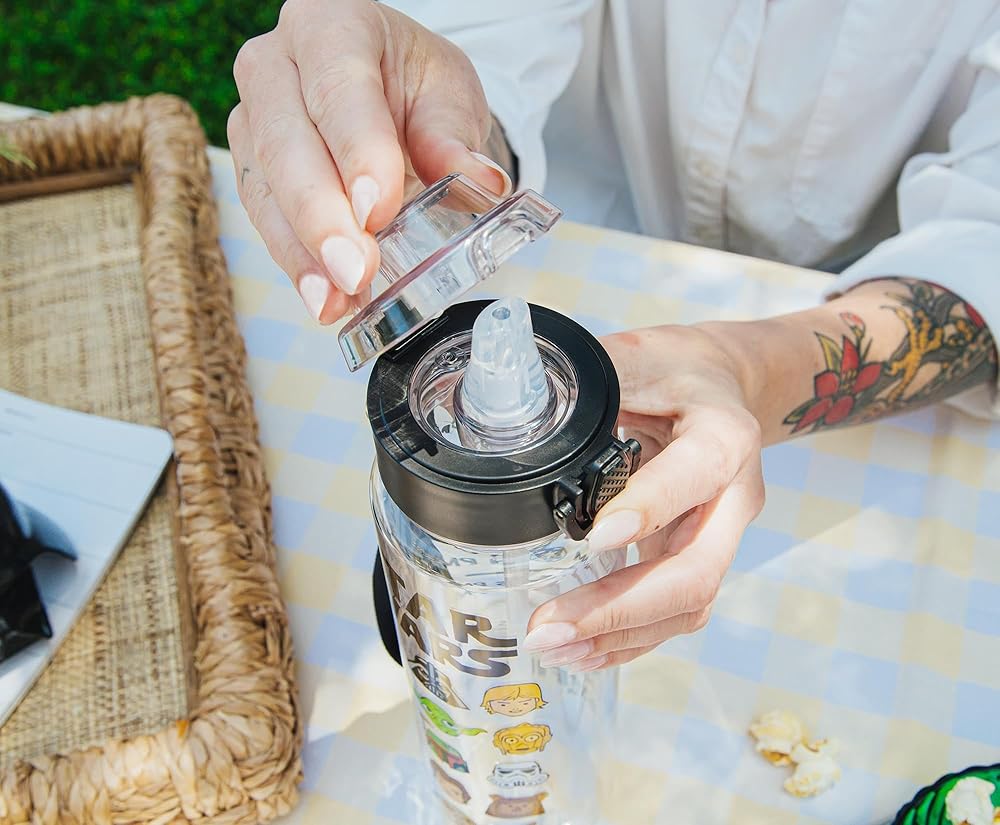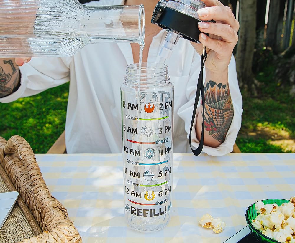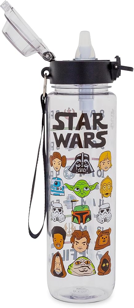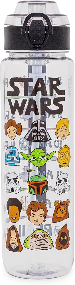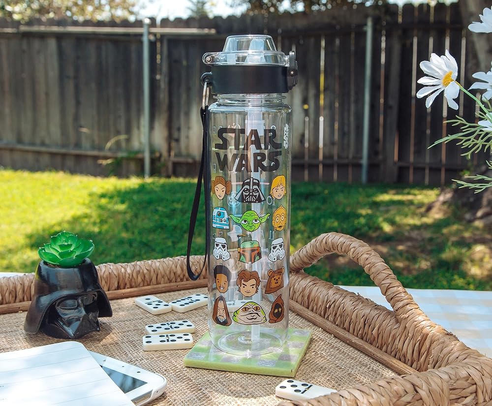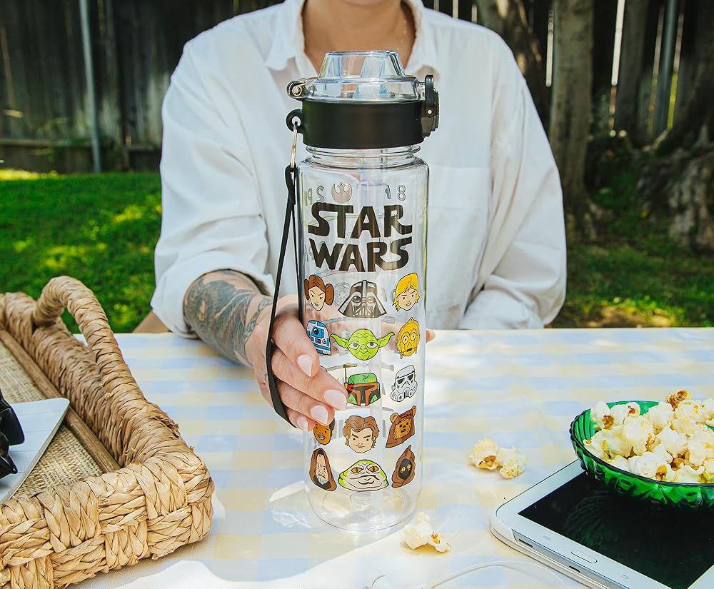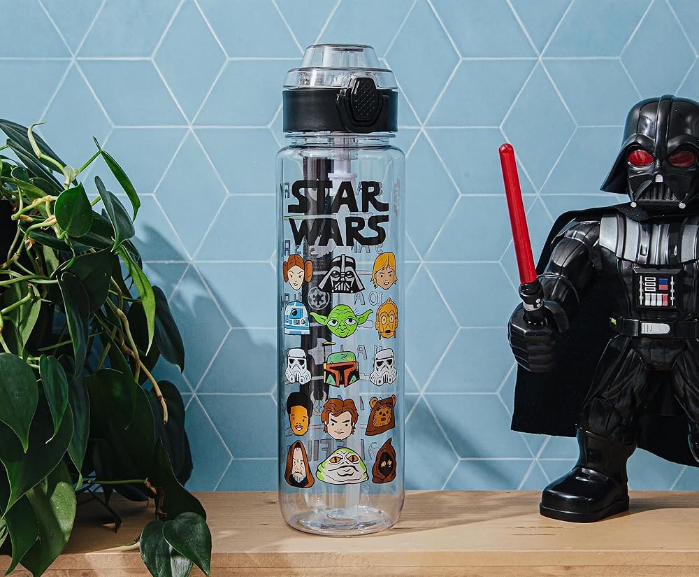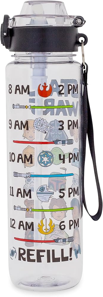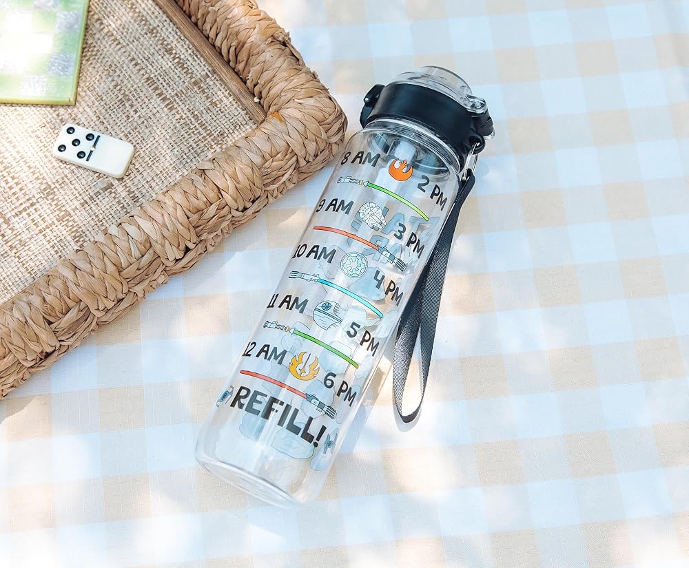 Take a trip to a galaxy far, far away with this themed water bottle! This Star Wars water bottle features various characters including R2-D2, Yoda, C-3P0, Jabba the Hutt, Chewbacca, Princess Leia, and Darth Vader. Written above the characters is “Star Wars.” Back of the water bottle features a hydration schedule showcasing various images of lightsabers and battleships. This schedule ensures hydration all day. Designed to keep you drinking water from 8am until 6pm. Stay hydrated on the go while eliminating the need for single-use plastic bottles. This water bottle holds up to 33 ounces of your preferred beverage. The size, locking lid, and strap make this water bottle ideal for travel. Whether on a road trip, at a picnic, or on an intergalactic journey, this water bottle will keep you hydrated. TOP RACK dishwasher safe ONLY. NOT safe for microwave use. Take a dive into the fictional world with Silver Buffalo! Silver Buffalo provides fans with official merchandise from their favorite characters. Working alongside licensors and brands, we create unique and imaginative products which are designed with great care and detail. Silver Buffalo aims to connect fans to their favorite cartoon characters, superheroes, movies, tv-series, and more. Celebrate your fandom!