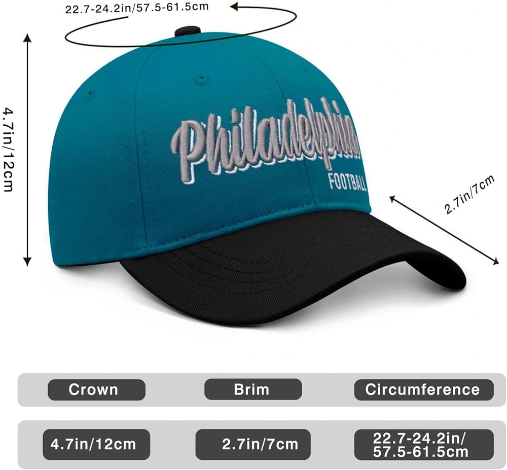 مقاس قبعات البيسبول: محيط القبعة: 22.7-24.2 بوصة (57.5-61.5 سم)؛ حافة القبعة: 2.7 بوصة (7 سم)؛ ارتفاع القبعة: 4.7 بوصة (12 سم). تم تصميم قبعات البيسبول للمدينة بعناية، مع إبزيم قابل للتعديل على الظهر، مناسب تمامًا لجميع أحجام الرأس. يهتف لكرة القدم المفضلة لديك!