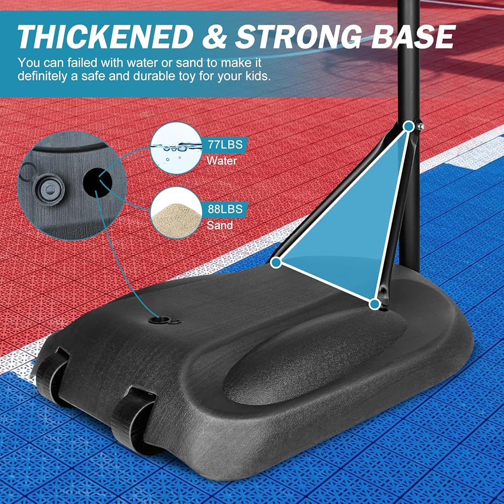 【قاعدة وهيكل ثابتان】تتميز قاعدة كرة السلة بتصميم قاعدة مثلثة ثابتة، ويمكن ملؤها بماء 77 رطلاً أو رمل 88 رطلاً. يوفر الهيكل المثلث الذي يتكون من العمود والقاعدة الثبات أثناء اللعب، مما يضمن أن طوق كرة السلة المحمول يتمتع بقاعدة قوية ومتينة في أي حال.