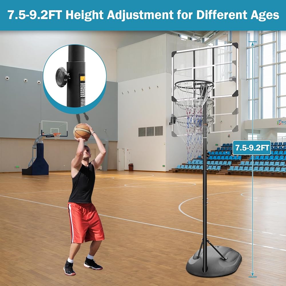 【طوق كرة سلة قابل للتعديل بارتفاع】سوف ينمو طوق كرة السلة القابل للتعديل مع أطفالك حيث يمكن تعديل الارتفاع من 7.5 قدم إلى 9.2 قدم (230-280 سم) لتلبية احتياجات الأطفال من مختلف الأعمار والأطوال ومستويات المهارات، ولتحفيز إمكانات الأطفال في الغطس.