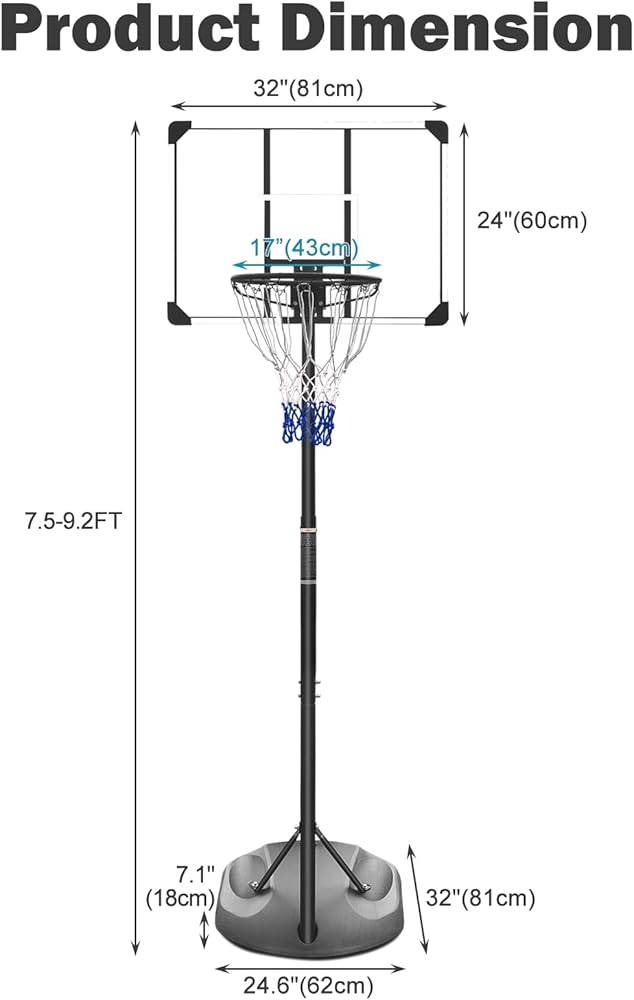 【تجميع سهل】تتضمن مجموعة طوق كرة السلة ما يلي: حجم اللوحة الخلفية: 32 بوصة (81 سم) × 24 بوصة (60 سم) × 1.2 بوصة (3 سم) (الطول × العرض × الارتفاع)، حجم القاعدة: 32 بوصة (81 سم) × 24.6 بوصة (62 سم) × 7.1 بوصة (18 سم) (الطول × العرض × الارتفاع)، القطر الداخلي لحافة كرة السلة: 17 بوصة (43 سم)، التعبئة الوزن: 9 كجم. من السهل تركيبه، ونحن نؤمن بأن إعداد طوق كرة السلة هذا لن يستغرق طوال اليوم.