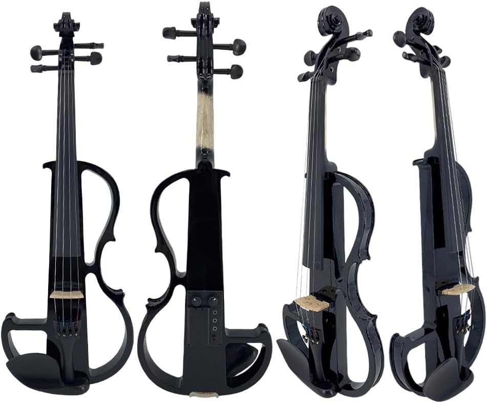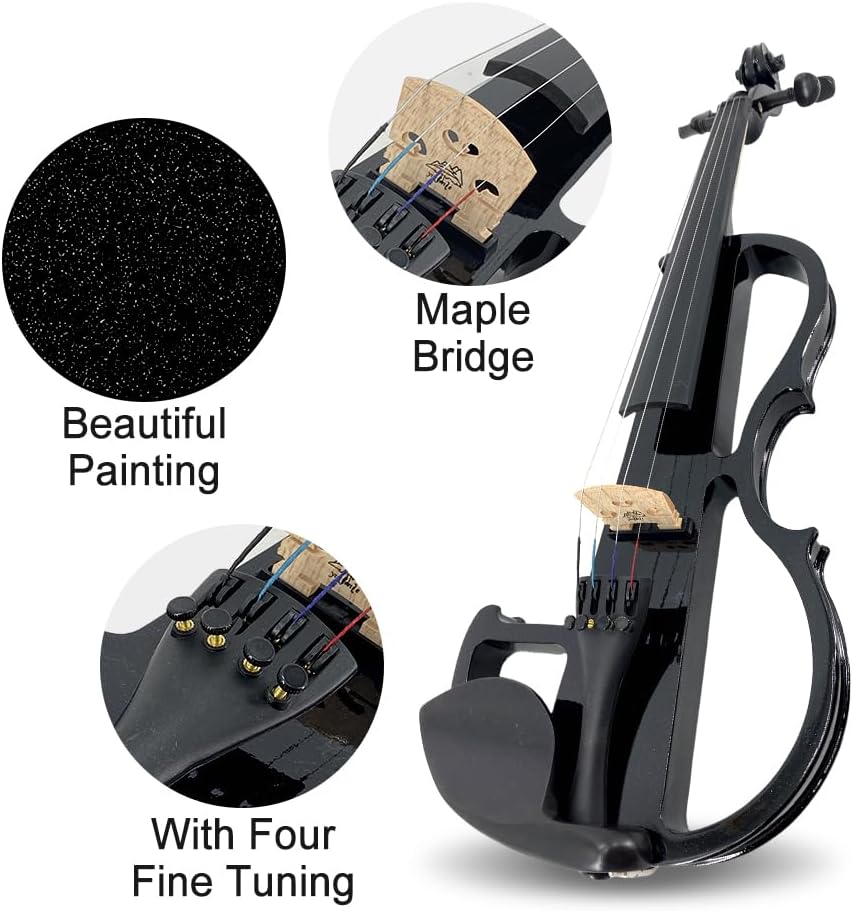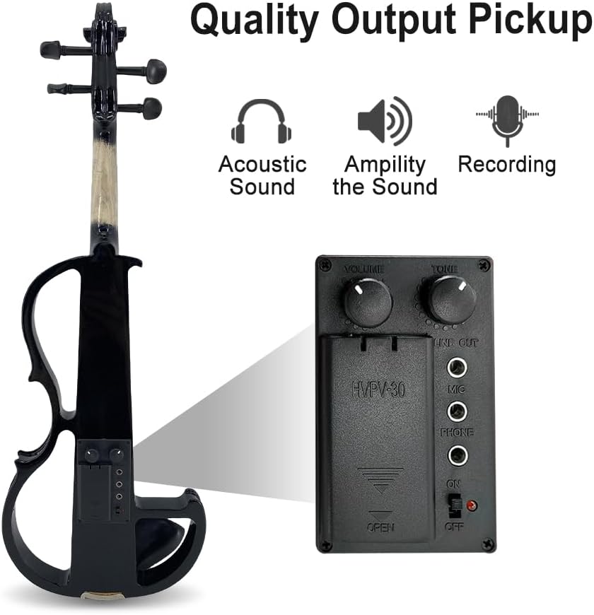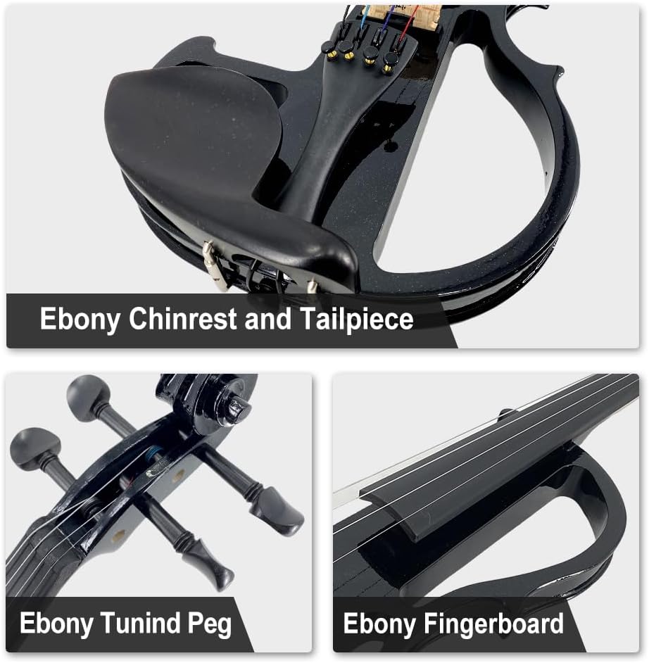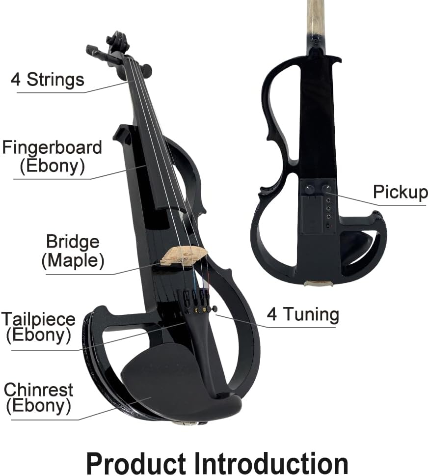 🎻Dynamic and Stylish ~ This 4/4 full-size electric violin is crafted from premium solid wood with a smooth metallic-finish lacquer coating. Its streamlined body exudes dynamic energy, featuring a natural ebony fingerboard, tuning pegs, solid wood chin rest, and an aluminum alloy tailpiece with precision tuners. It produces a rich, pure tone that is sure to impress.