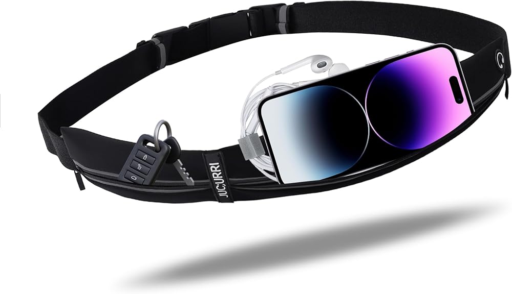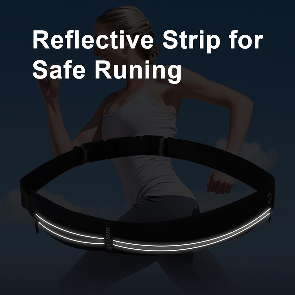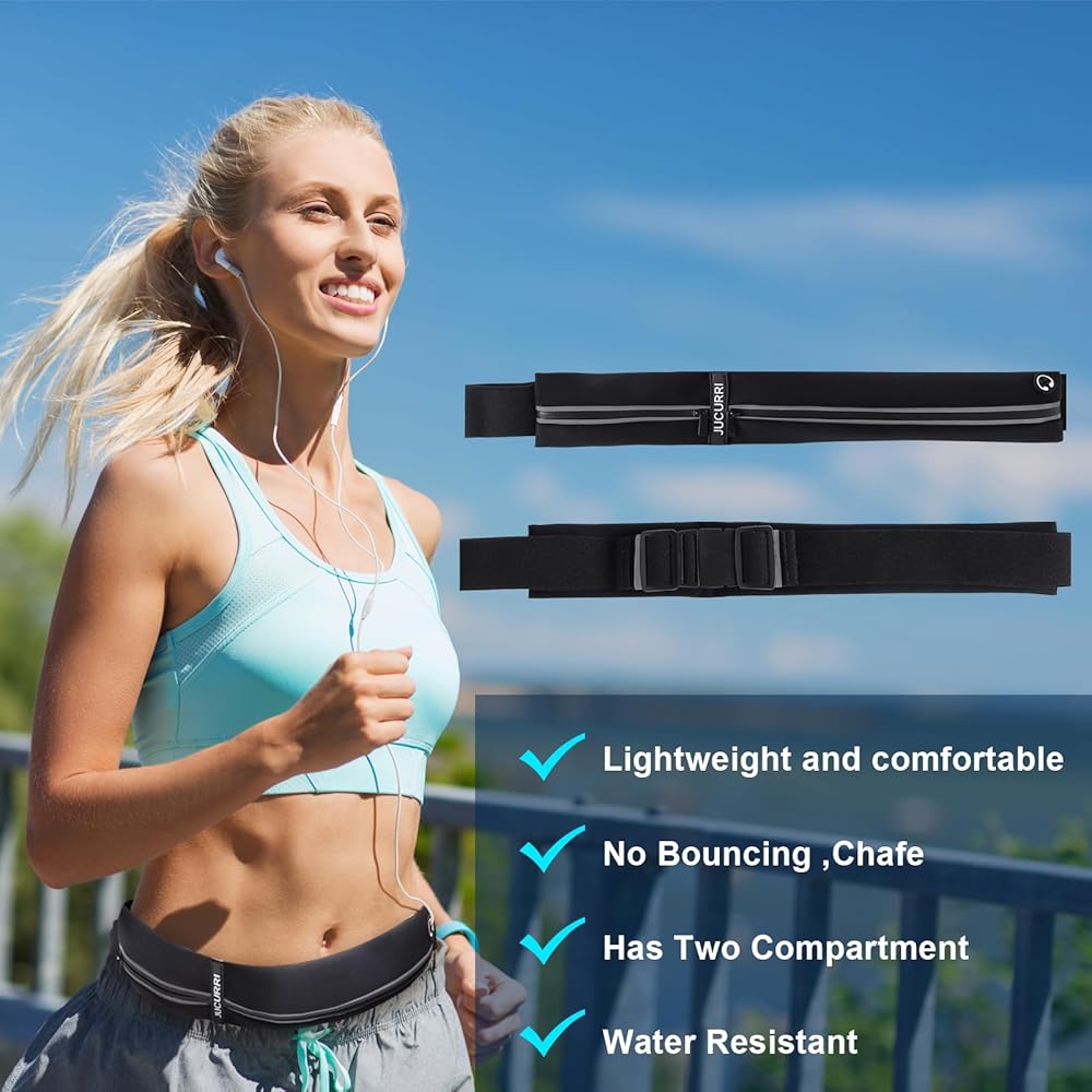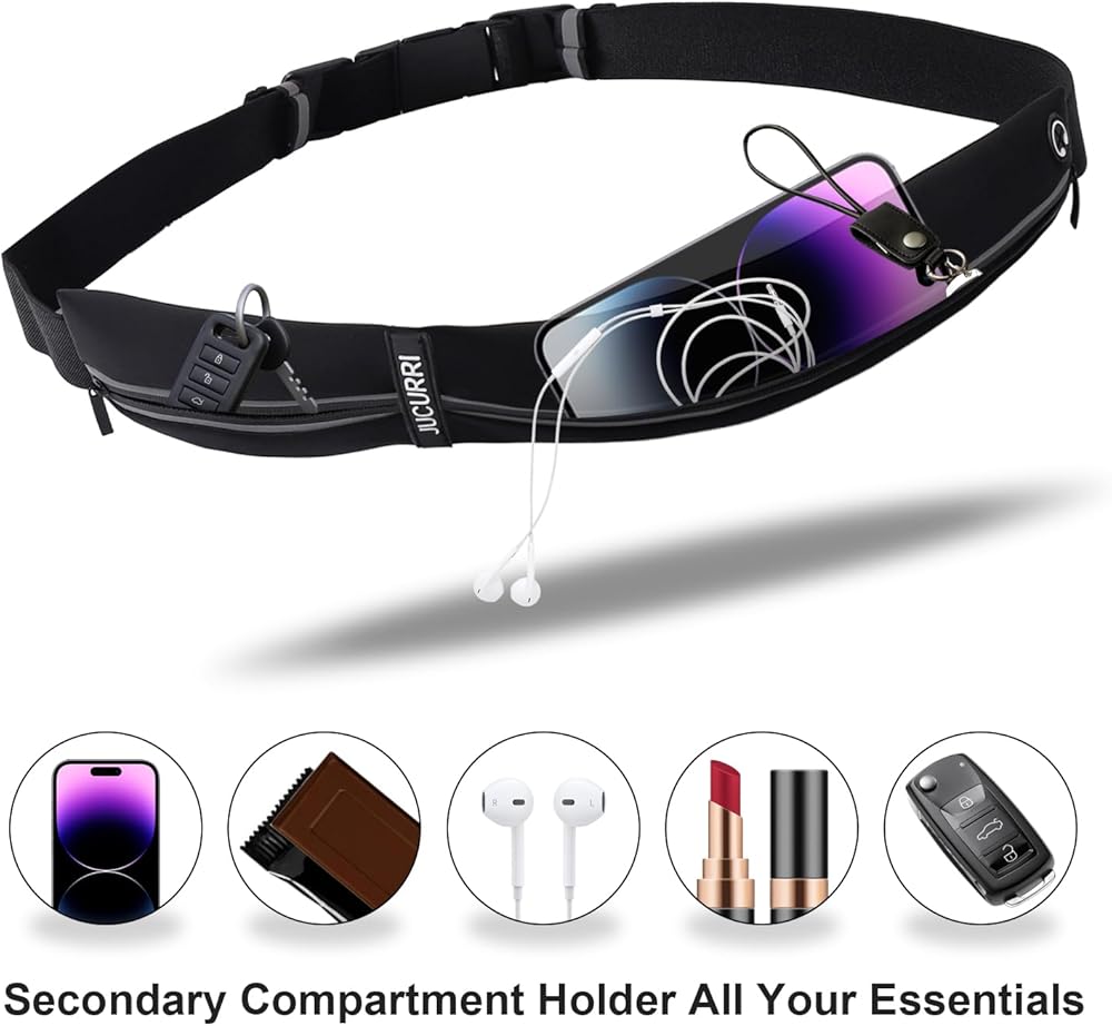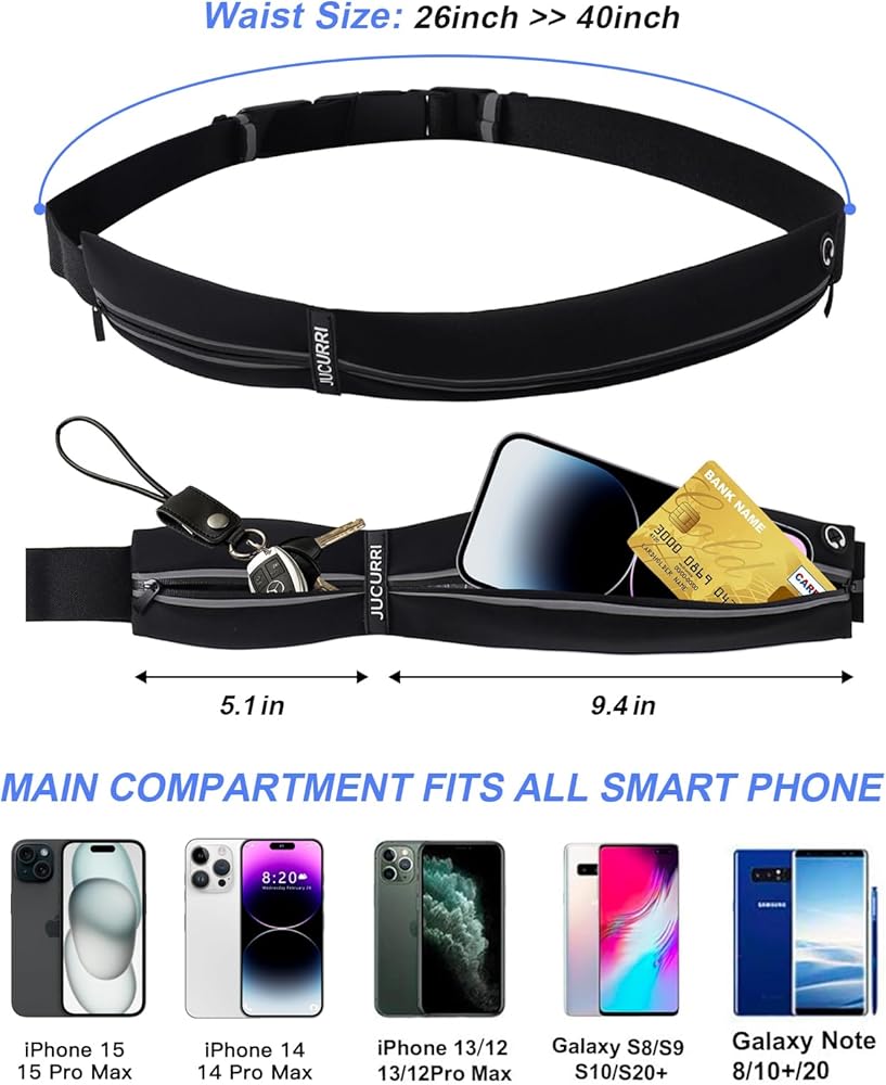 حزام جري نحيف للنساء والرجال، حامل هاتف مقاوم للماء للجري، حزمة خصر عاكسة بجيبين لتخزين أساسيات العداء بأمان، حزمة فاني العداء، حزام المال يناسب معظم الهواتف (أسود)