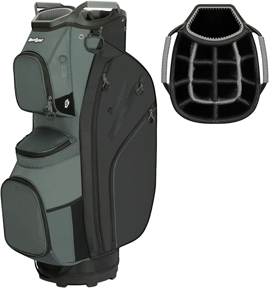 Ample Storage: Our 15 slot cart golf bag offers ample storage with 11 pockets, including a cooler pocket, large side pocket, zipped waterproof valuables pocket, front ball pocket, and multiple organizers. Plus rain hood cover, towel ring and large velcro glove attachment. It provides enough space for all your golf cart accessories.