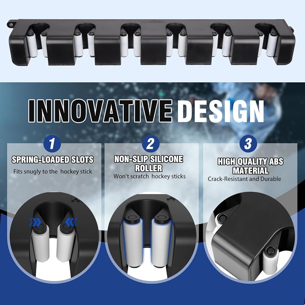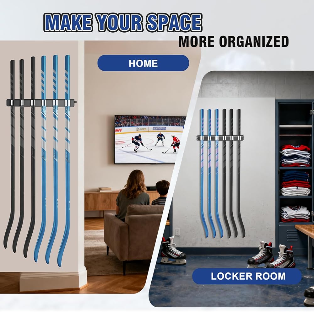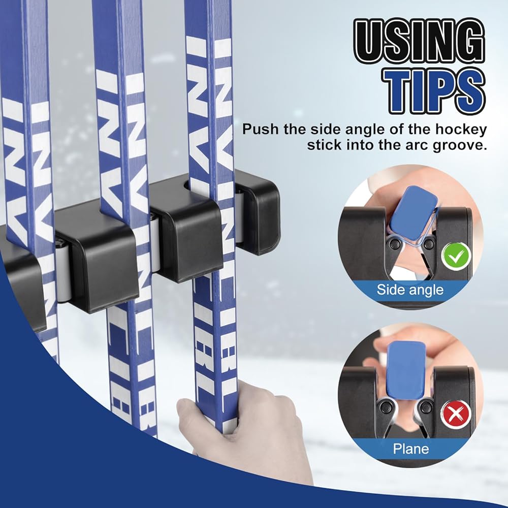 [تركيب سريع وجميل] فقط 4 خطوات لتثبيت حامل عصا الهوكي على الحائط بالكامل، يحل مشكلتك الأكثر قلقًا - تخزين آمن ومريح ومنظم لجميع عصي هوكي الجليد، كما أنه هدية مثالية لمحبي هوكي الجليد. (ملاحظة الاستخدام: ادفع الزاوية الجانبية لعصا الهوكي إلى داخل الأخدود القوسي)