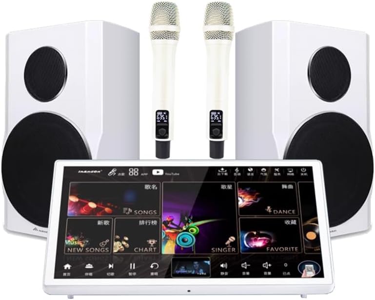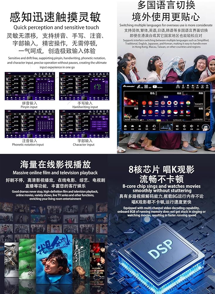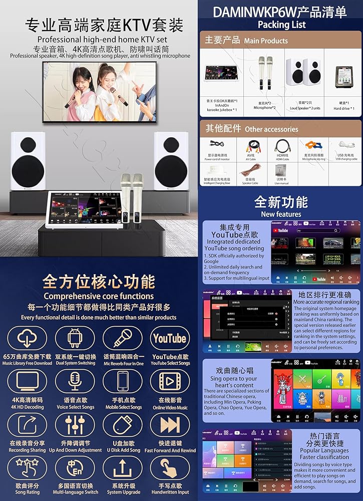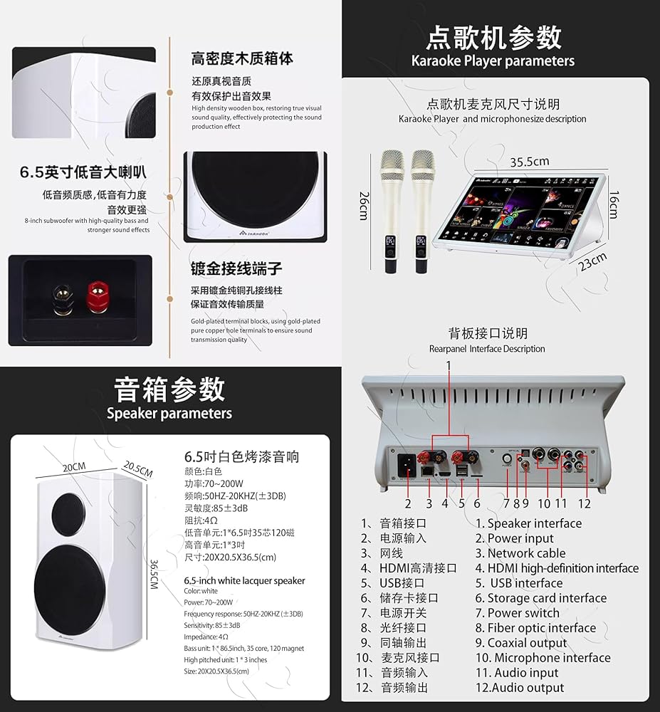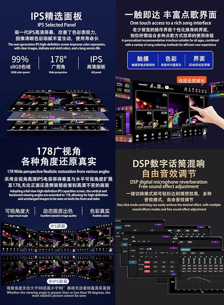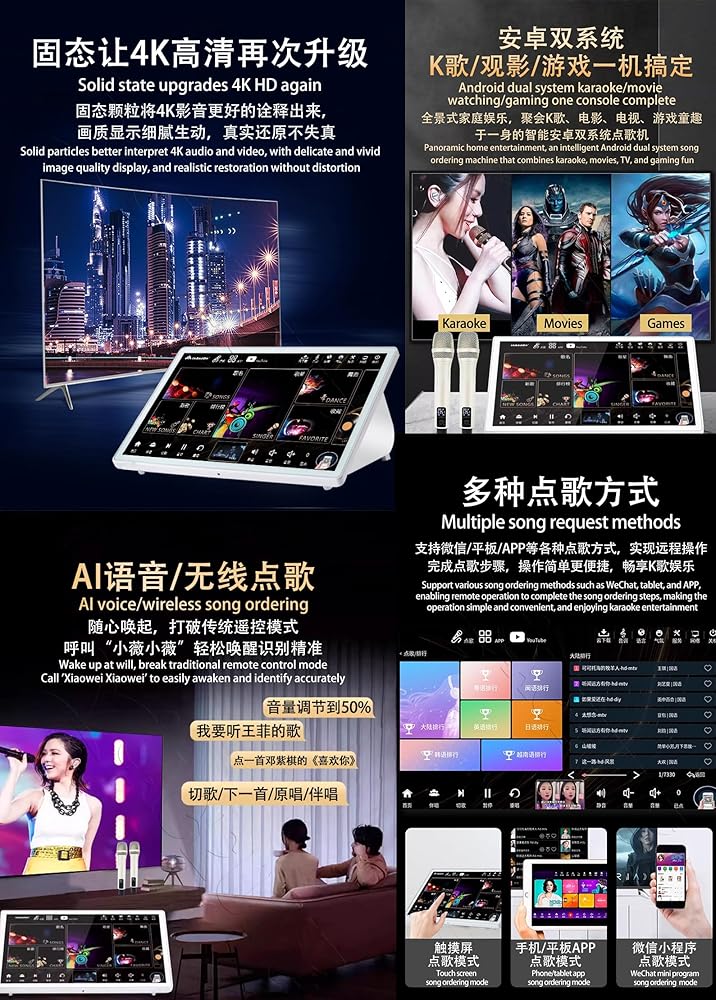 • [SYSTEM FEATURES]Simple wiring installation 480000 Cloud Music Library Intelligent voice song request Professional HIFI audio quality Upgrade the five in one machine Android Dual System Professional binary audio system Built-in DSP reverb True