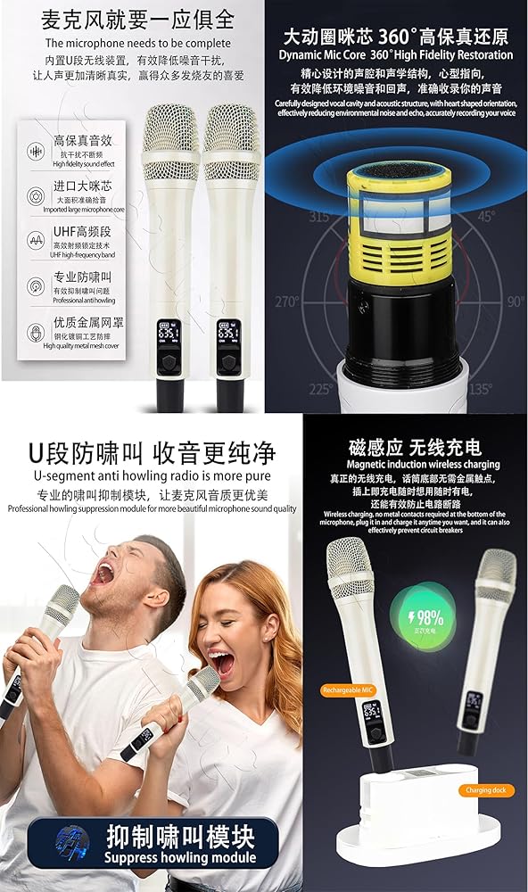 • [FUNCTION FEATURES]Dual frequency speaker, HD high-definition song player, anti howling MIC