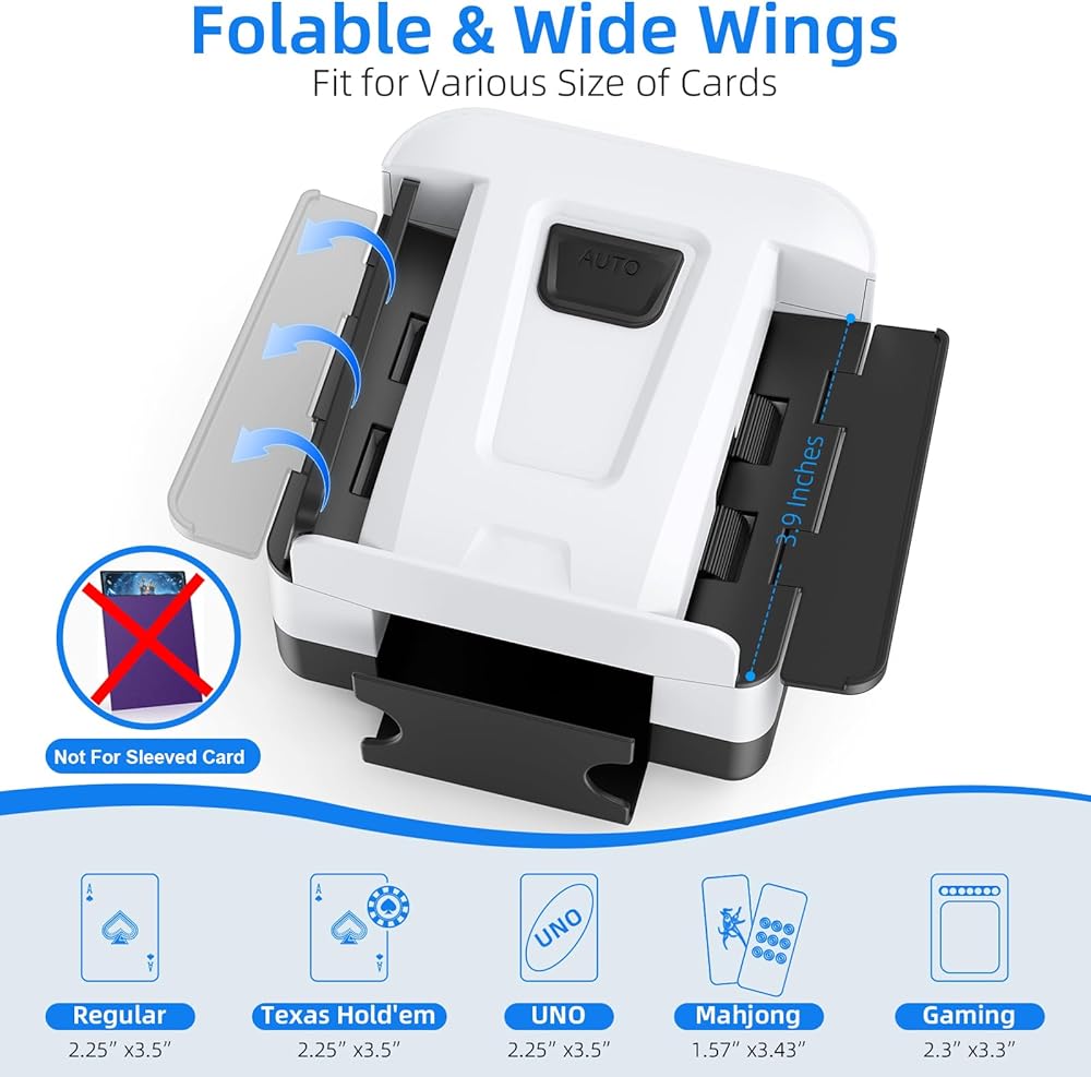 توافق واسع النطاق: جناح واسع وقابل للطي على كلا جانبي وحدة خلط البطاقات يمكن أن يكون مسطحًا من 1 إلى 2 طابق في كل مرة، يستوعب جهاز خلط البطاقات هذا بسهولة أحجام البطاقات المختلفة مثل البوكر، والجسر، والرومي، وأونو، وبلاك جاك، والبستوني، والمرحلة 10، وخمسة تيجان، وسكيب بو، واليد والقدم، والمزيد من ألعاب البطاقات ذات الحجم القياسي.