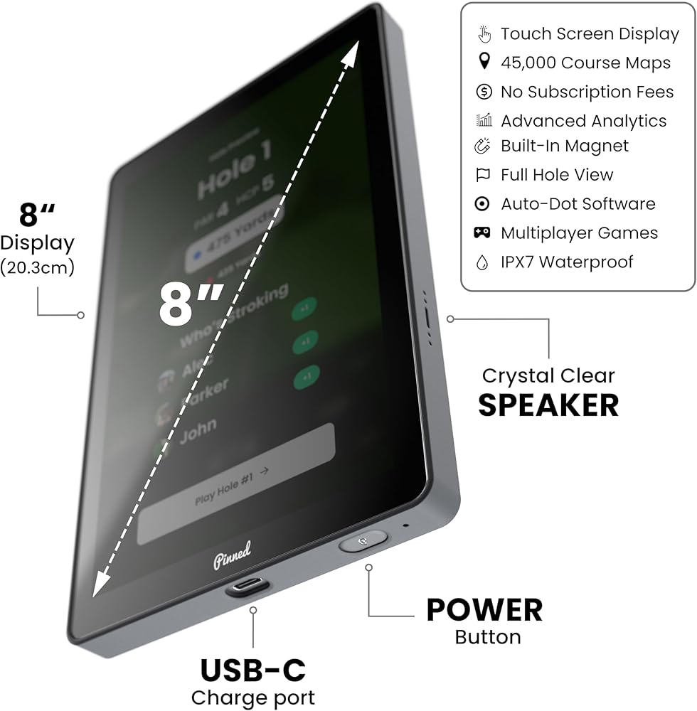 Elevate your golf game with The Caddie, the first ever portable GPS golf tablet by Pinned Golf. With its large 8‑inch high-definition screen, you get a full 360° view of each hole, enabling you to plan smarter shots and visualize hazards clearly. The unit comes preloaded with data for over 45,000 golf courses worldwide, so there's no need to worry if you're playing off the beaten path. One of The Caddie's standout features is that it requires no subscription fees — purchase it once and enjoy full access forever. The device also integrates a strong built‑in magnet, letting it firmly attach to metal surfaces on your golf cart for convenient viewing. Built to last, it's weatherproof and durable, ready to endure the elements as you focus on your swing. Whether you're tracking scoring, exploring advanced stats, or switching between match play modes, The Caddie is the high-tech companion your rounds have been missing.