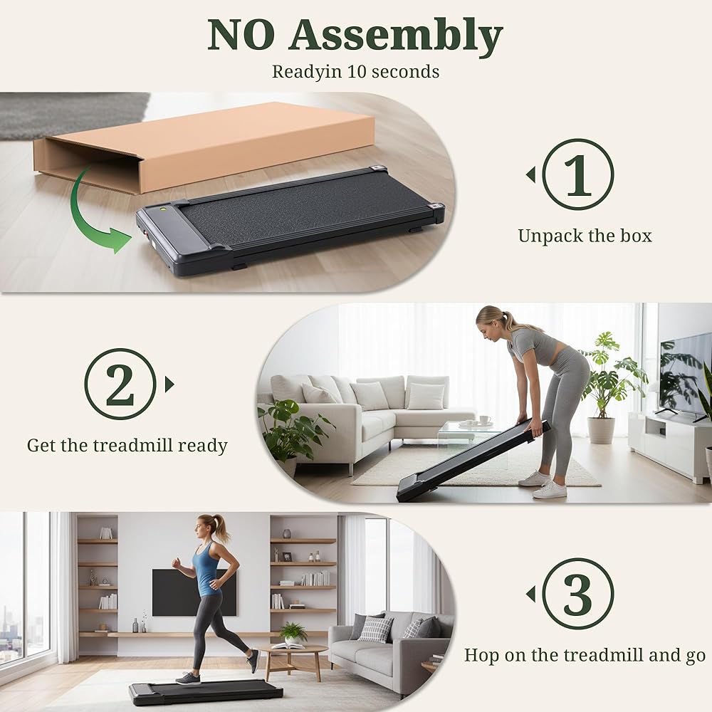 【No Assembly & Portable Design】This under desk walking pad (44.3*22*3.6”, 35lbs) needs no setup. 2 wheels enable easy movement; store under sofas/beds. Ready to use instantly, this portable treadmill is great for walking/jogging at home or the office.