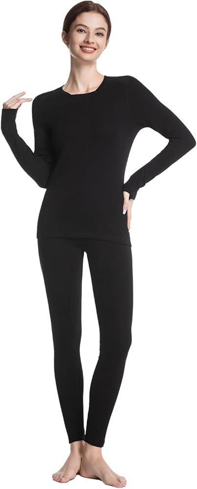 ناعمة ومريحة: ملابس داخلية حرارية للنساء مع بطانة من الصوف الناعم تحبس حرارة الجسم - مجموعة الملابس الداخلية الحرارية النسائية الأكثر راحة لفصل الشتاء. مثالية للاسترخاء أو النوم أو ارتداء طبقات من الملابس، حيث تبدو مجموعة الصالة المسامية هذه وكأنها حضن دافئ على بشرتك