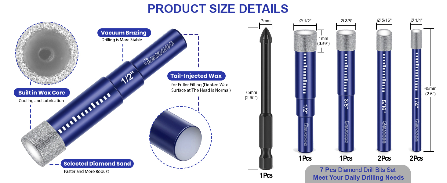 المجموعة الكاملة: تشتمل رؤوس مثقاب البلاط هذه على أحجام 2*1/4 بوصة، 5/16 بوصة، 3/8 بوصة، 1/2 بوصة، وقطعة مثقاب متقاطعة (لوضع الثقب)، تلبي احتياجات قطر الفتحة المختلفة. تأتي مع حقيبة تخزين محمولة لسهولة التنظيم والوصول