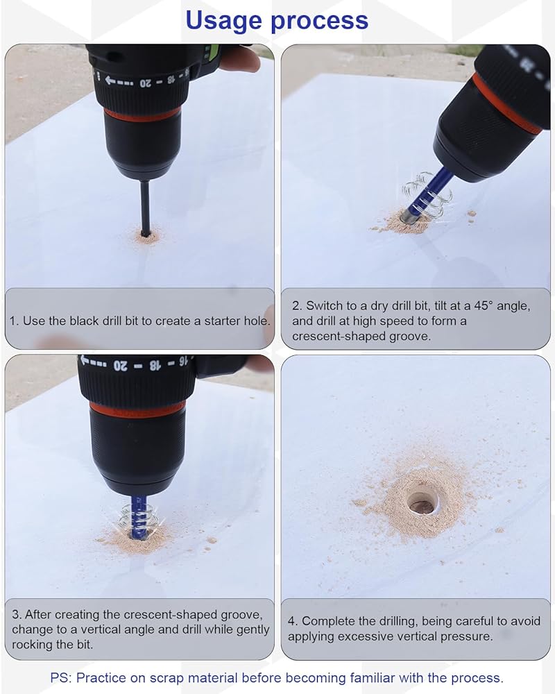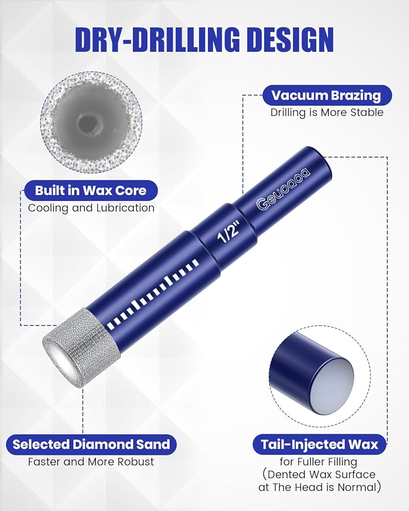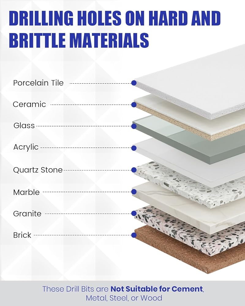 تطبيق واسع: تم تصميم رؤوس الثقب الماسية هذه لحفر الثقوب في البلاط والبورسلين والجرانيت والرخام والزجاج والحجر والأكريليك والبلاستيك الصلب. متوافق مع معظم المثاقب الكهربائية والمثاقب اليدوية ومثاقب المقاعد (ليس للأسمنت أو المعدن أو الفولاذ أو الخشب.)