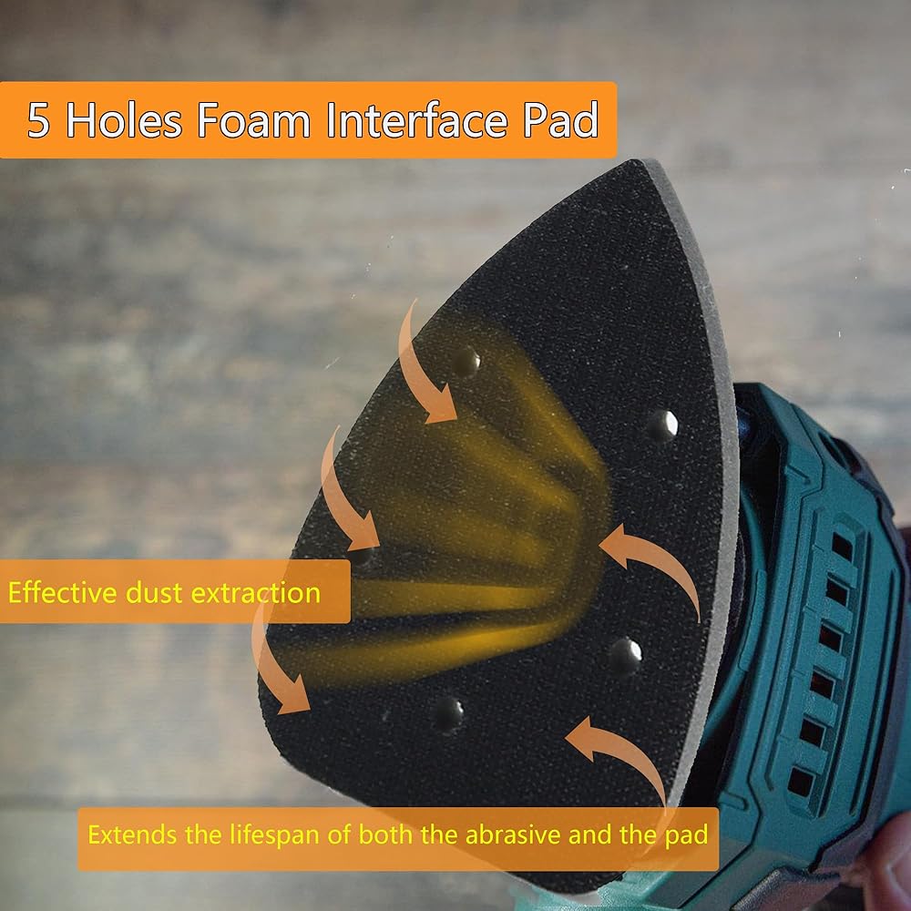 HOOK & LOOP DESIGN: The mouse interface pad with hook and loop design for swift and efficient changes of abrasives, enabling the reuse of partially utilized abrasive materials. One side has a HOOK surface for attaching sanding discs, while the other side features a LOOP surface for attaching sanding pads.5-holes design for effective dust extraction. This ensures a cleaner work environment, better finishing results, and extends the lifespan of both the abrasive and the pad.