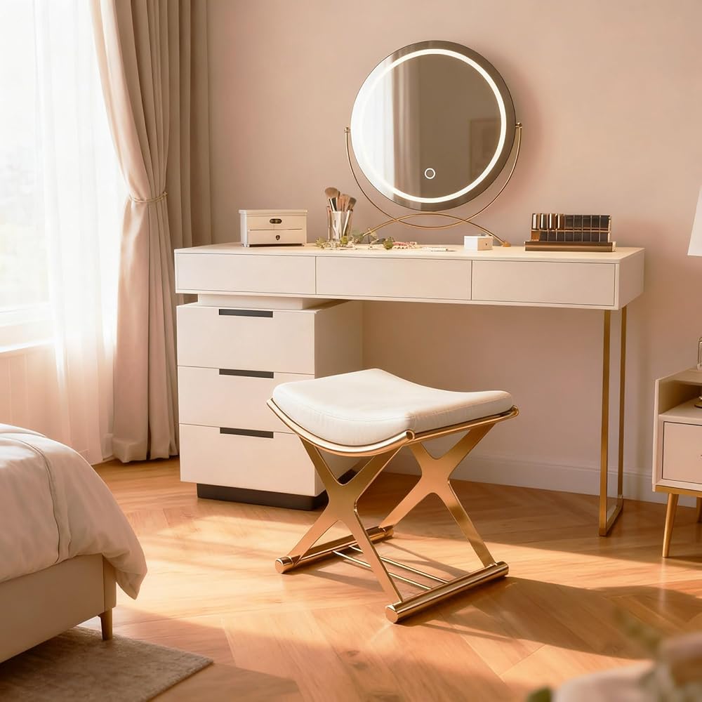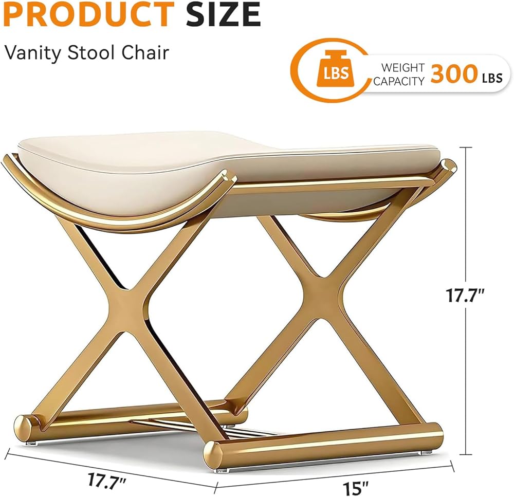 Versatility: Not just a vanity stool, it doubles as a footstool, living room ottoman, makeup chair, bathroom stool, closet chair, and more. Its lightweight, compact design makes it easy to move and fits perfectly in spaces large or small.