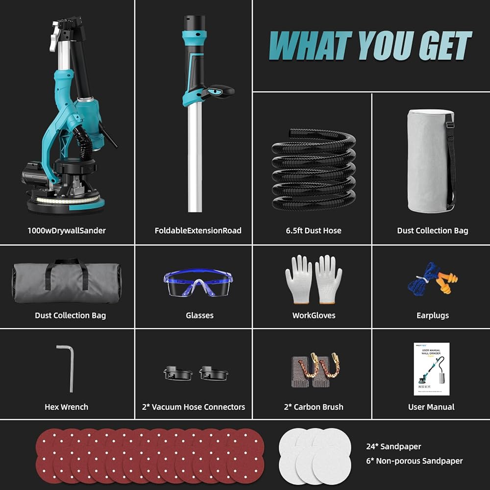 • 【خارج الصندوق】1 ماكينة صنفرة للجدران الجافة، 30 ورقة من ورق الصنفرة (4 * A80#/100#/120#/150#/180#/240# ورق صنفرة + 6 * ورق صنفرة غير مسامي)، 1 خرطوم مكنسة كهربائية بطول 6.5 قدم، 1 كيس غبار، 1 حقيبة حمل، 1 مفتاح ربط سداسي، 2 فرش كربون، 3 محولات خرطوم مكنسة كهربائية، مجموعة واحدة من معدات السلامة (زوج واحد من نظارات واقية، زوج واحد من سدادات الأذن، قناع واحد)، ودليل مستخدم واحد. جاهز للاستخدام مباشرة بمجرد إخراجه من الصندوق.