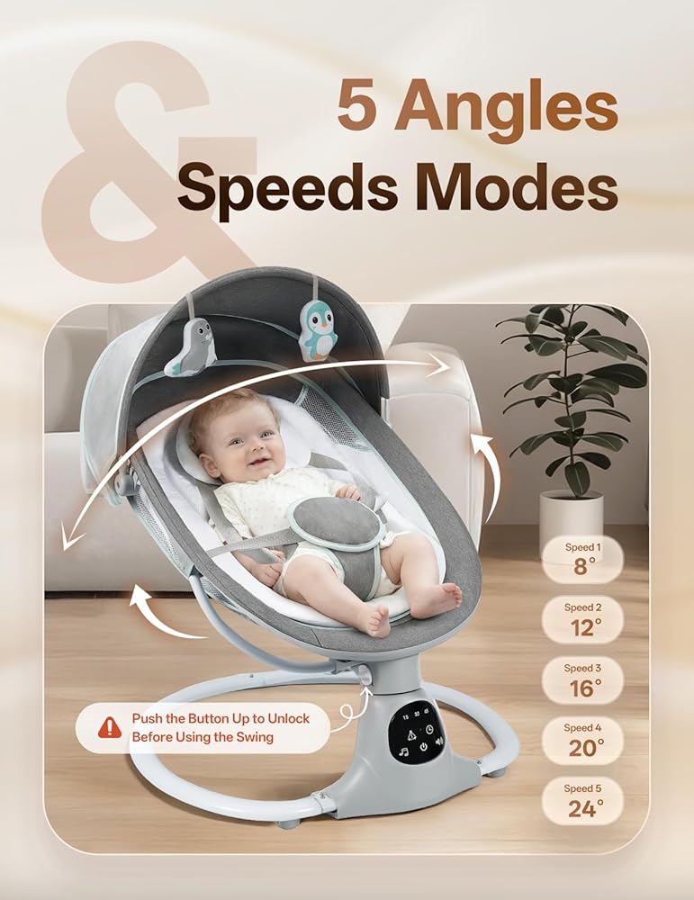 【تصميم حديث】يتميز بـ 5 سرعات تأرجح و3 وظائف توقيت، يمكنك ضبط كرسي هزاز الأطفال بمرونة للعثور على تردد التأرجح الذي يحبه الطفل لتهدئة طفلك. تعمل لوحة اللمس المتقدمة وجهاز التحكم عن بعد على جعل تشغيل أرجوحة الأطفال أمرًا سهلاً ومريحًا