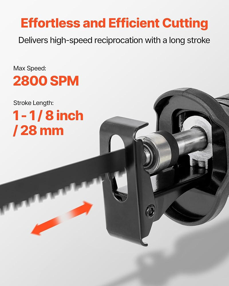 • قطع عالي الكفاءة: يوفر هذا المنشار الترددي سرعة تصل إلى 2800 SPM وشوطًا بعرض 1-1/8 بوصة / 28 مم لعمق الخشب الأقصى 5.91 بوصة / 150 مم (0.315 بوصة / 8 مم من المعدن)، مما يجعل القطع السميكة سريعة وفعالة