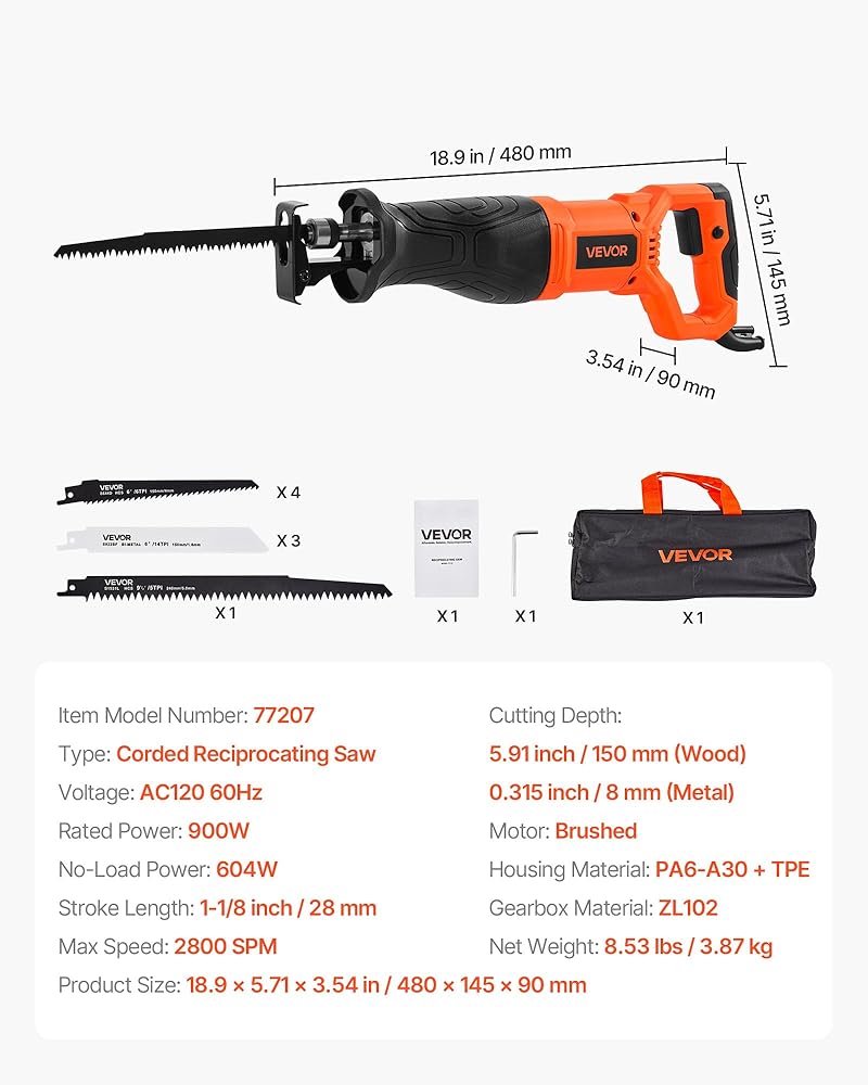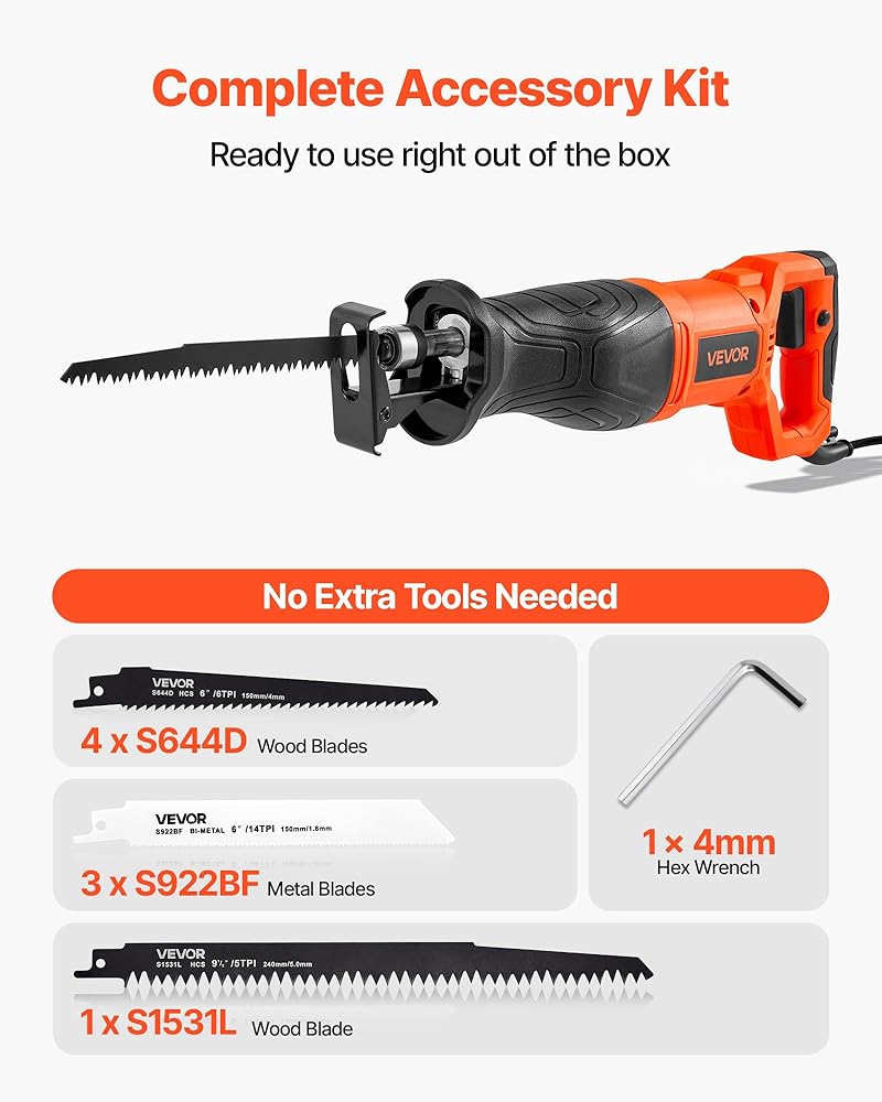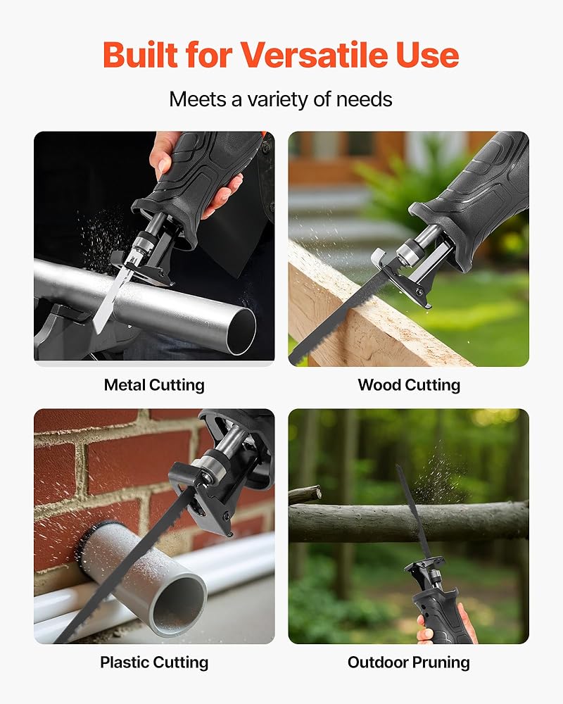 • جاهز متعدد المشاهد: يتعامل المنشار الترددي الكهربائي مع قطع الخشب وقطع البلاستيك وقطع المعادن والتقليم الخارجي بسهولة. بفضل سعته العميقة، فإنه يتعامل مع كل شيء بدءًا من الأعمال اليدوية المنزلية وحتى المهام الصعبة في الموقع