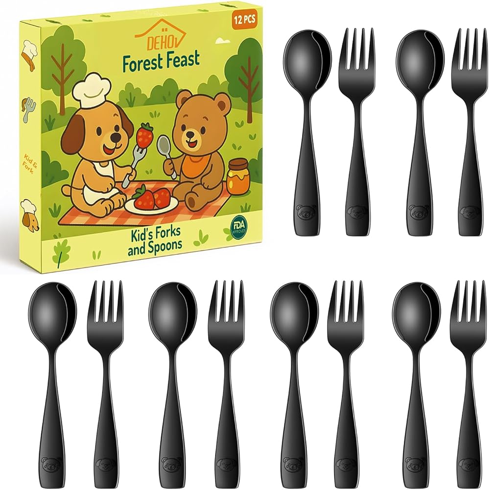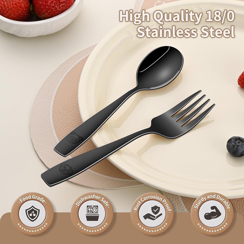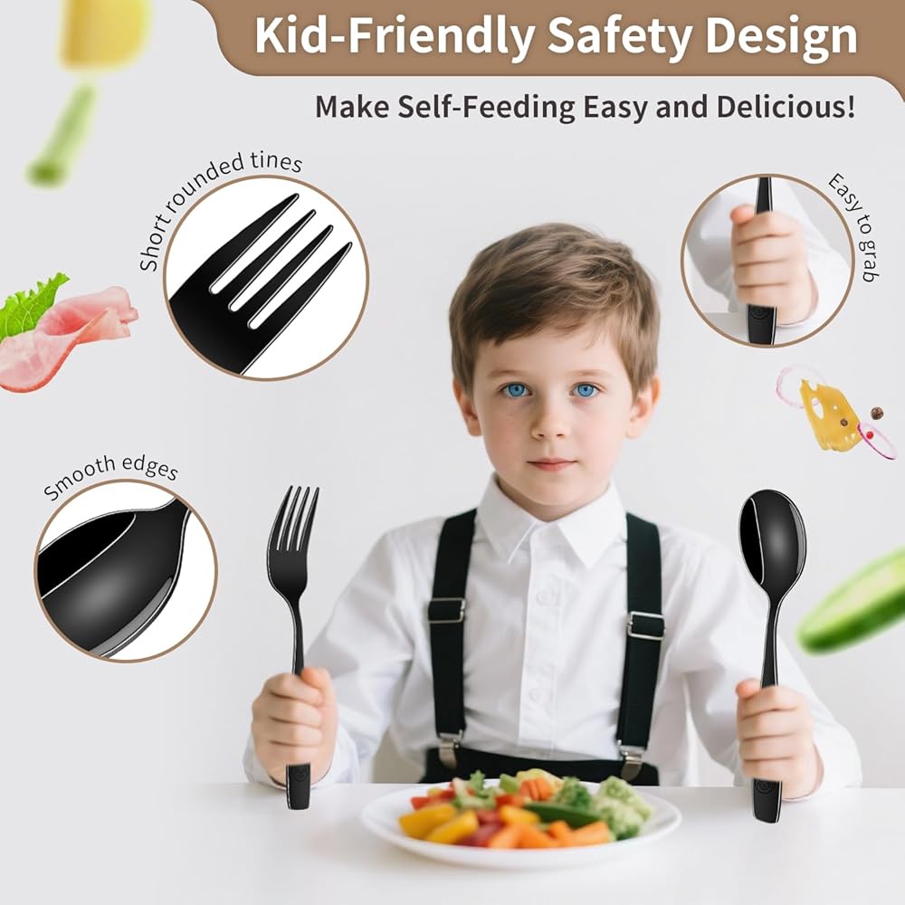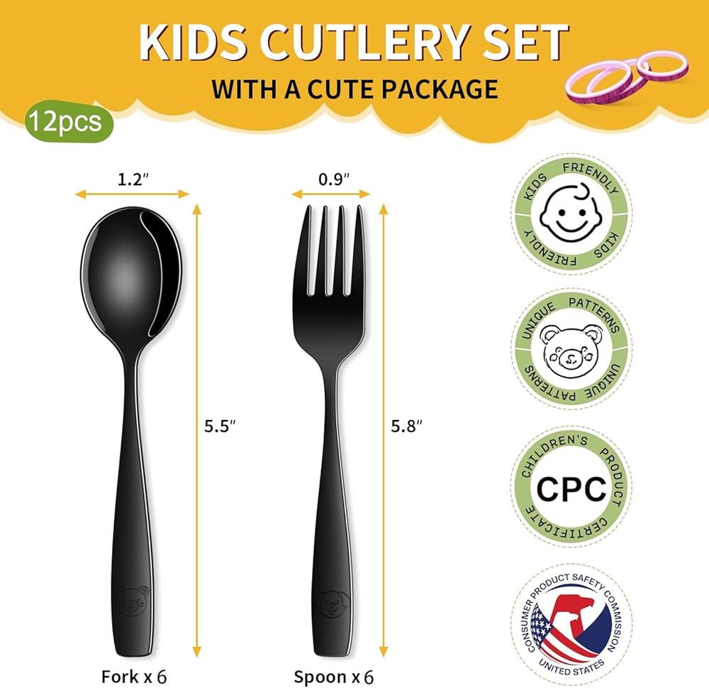 • 🍽️ مجموعة مكونة من 12 قطعة - تتضمن 6 شوكات بحجم الأطفال و6 ملاعق، رائعة للعائلات أو الرعاية النهارية أو النسخ الاحتياطية لأوقات الوجبات المزدحمة.