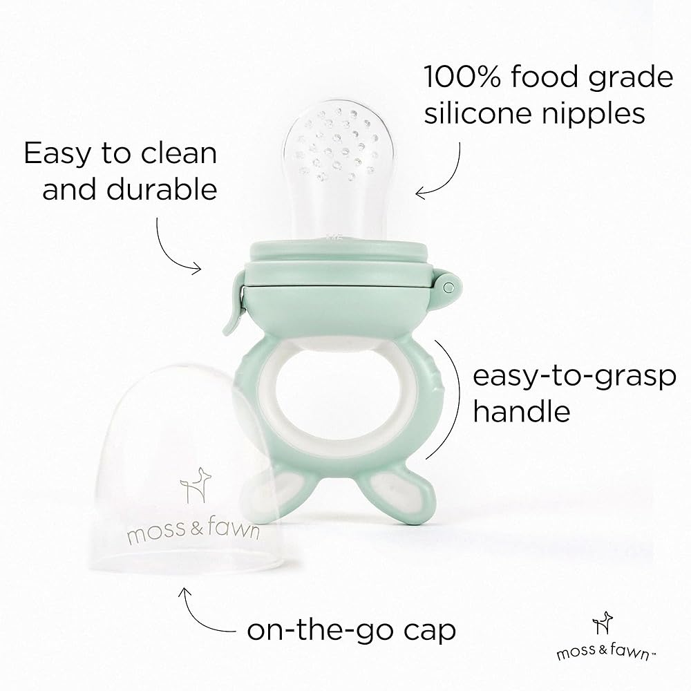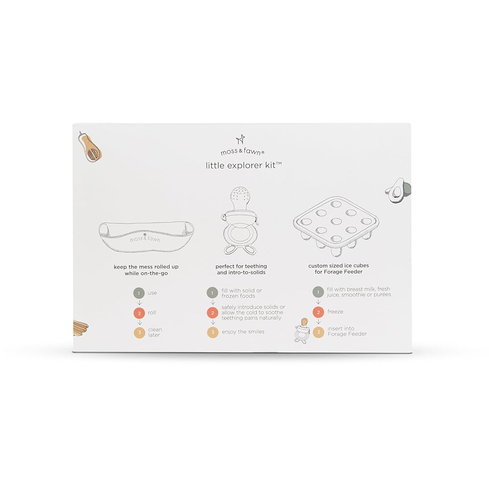 • مجموعة أغذية الأطفال المثالية | تعتبر وحدة تغذية العلف من Moss & Fawn وصينية مكعبات الثلج ومريلة Gather & Roll كلها مفيدة في تعريف الأطفال بالأطعمة الصلبة وتهدئة التسنين.
