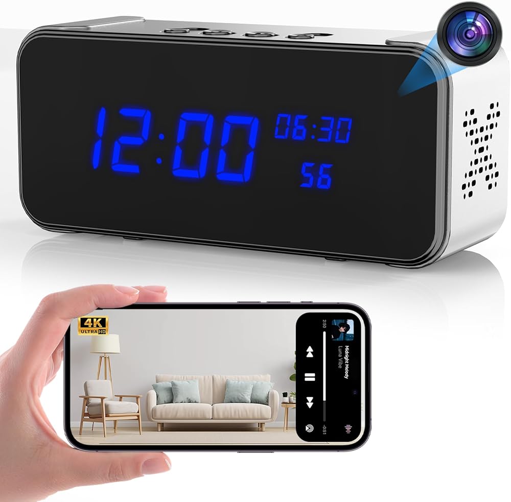 مكبر صوت بلوتوث مع ساعة كاميرا مخفية، كاميرا داخلية لاسلكية فائقة الدقة 4K HD لأمن المنزل - كاميرا مربية صغيرة مع رؤية ليلية، كشف الحركة الذكي، بث مباشر عن بعد