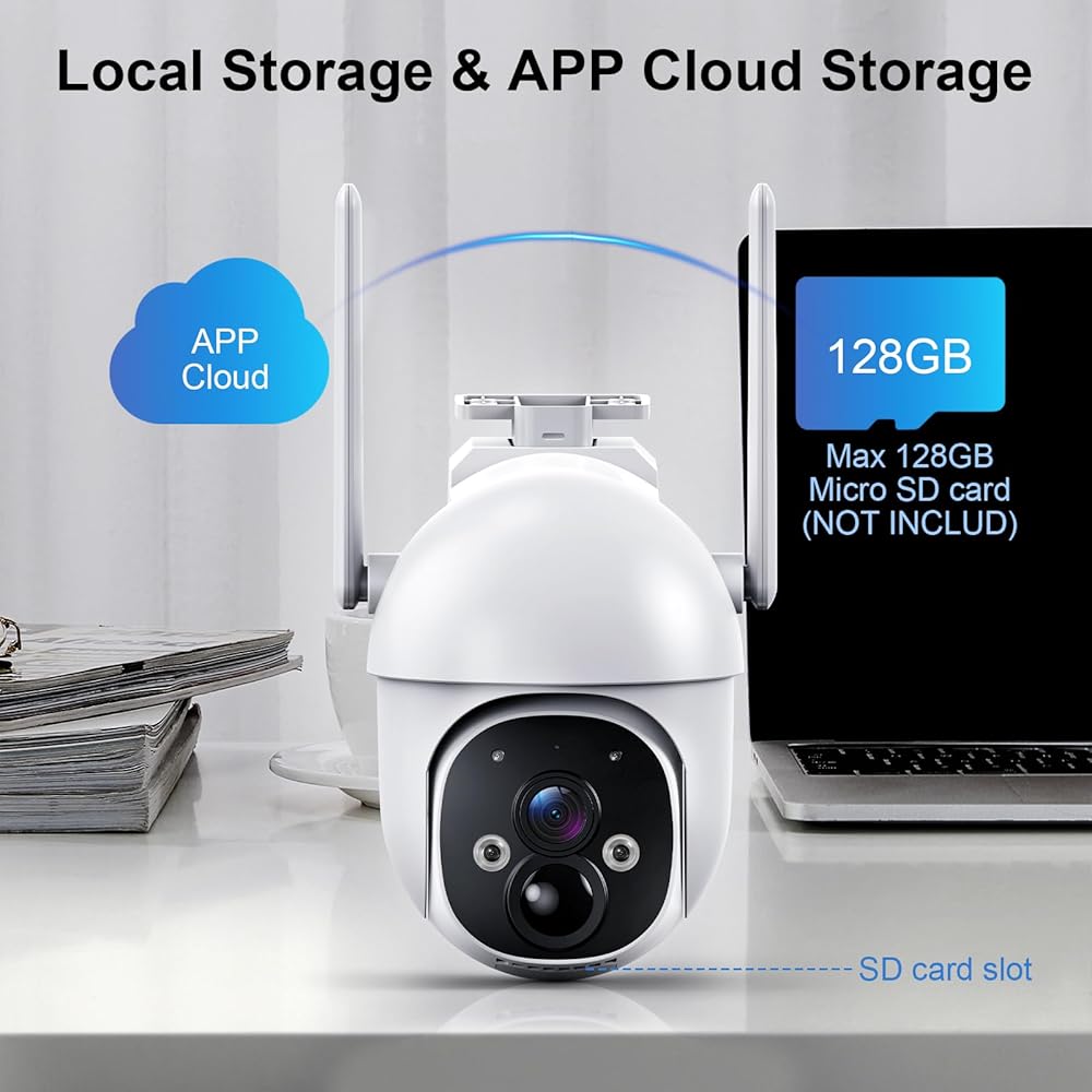 【سهولة الإعداد والتخزين في اتجاهين】اتصال واي فاي موثوق ومستقر بسرعة 2.4 جيجا هرتز (5G غير مدعوم)، يمكنك تسجيل الفيديو بسهولة والوصول عن بعد إلى الكاميرا الخاصة بك من أي مكان وفي أي وقت. يمكنك دعم تخزين بطاقة SD بسعة 128 جيجابايت (غير متضمنة) والتخزين السحابي الاختياري (7 أيام مجانًا، يلزم الاشتراك)