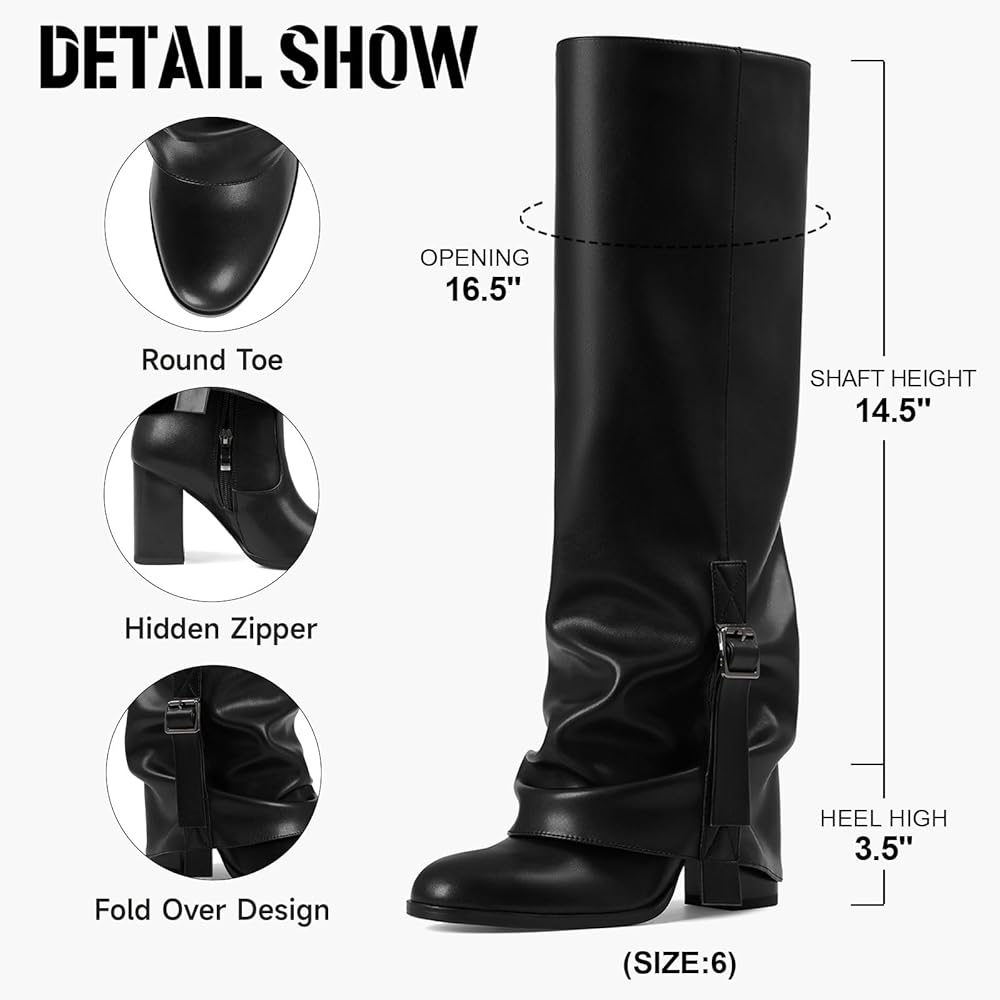 المواد والمقاس: تستخدم الأزواج السوداء جلدًا فاخرًا وناعمًا ومقاومًا للماء ومتينًا. يتميز اللون البني/الشوكولاتة بجلد سويدي ناعم، مسامي بملمس فاخر. المقاس 6 له عمود 18.2 بوصة (ارتفاع الركبة)، محيط 17 بوصة، كعب مكتنز 3.35 بوصة. خياطة معززة تضمن طول العمر.