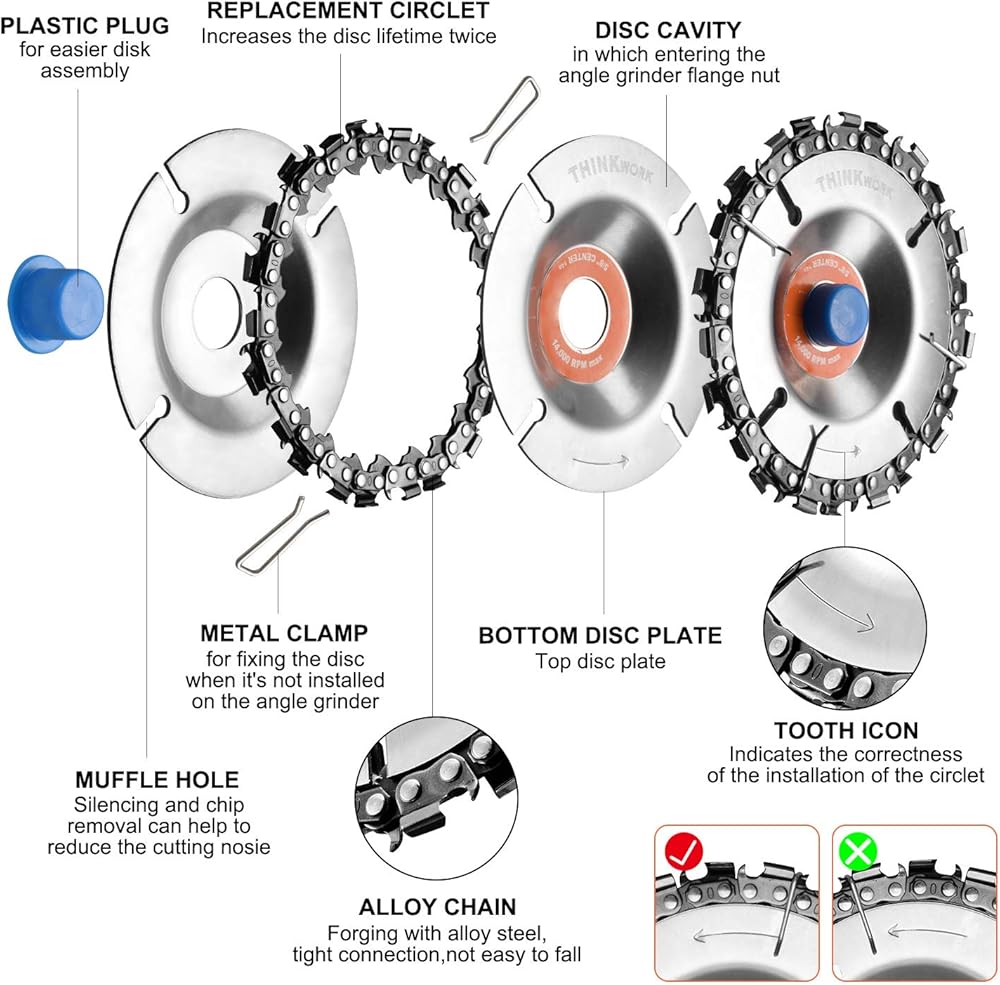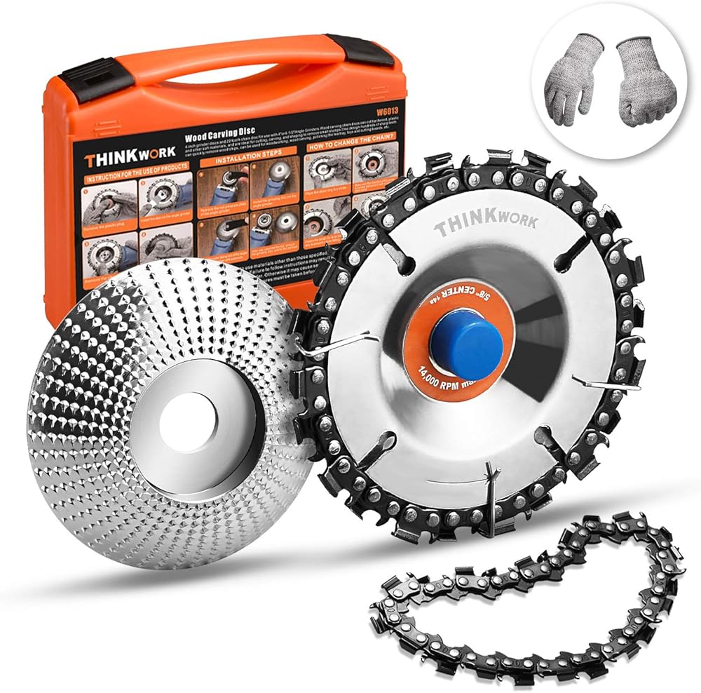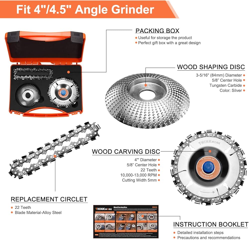 【استخدام واسع】أقراص سلسلة نحت الخشب من Thinkwork وأقراص تشكيل عجلة الطحن مناسبة للمواد غير المعدنية، ومناسبة لأي خشب، وتقطع كل شيء من الخشب الصلب والبلاستيك والمواد الناعمة الأخرى، دون القلق بشأن الأماكن الصلبة مثل الصدمات الخشبية. مثالية لقطع ونحت وإزالة جذوع الأشجار الصغيرة. مقاومة جيدة للتآكل، يمكن أن تخدمك لفترة طويلة.