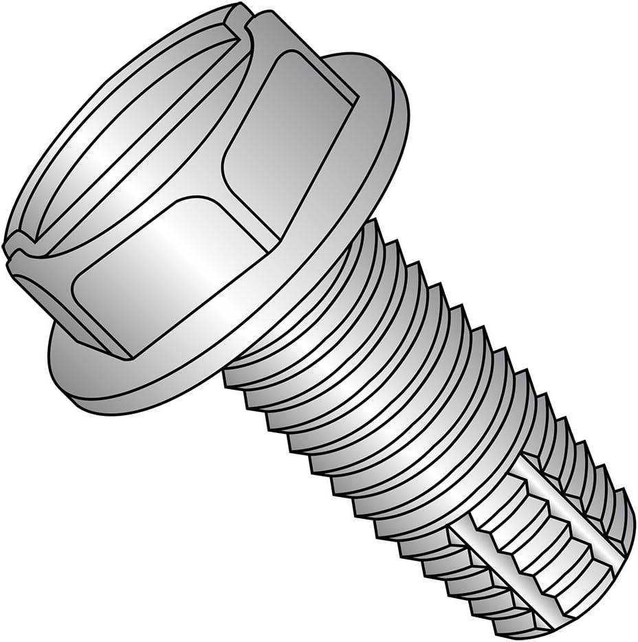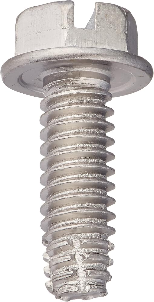 The 410 stainless steel thread cutting screw has a plain finish, a Type F point style, and a hex washer head with a slotted drive. The type F point is suitable for heavy gauge sheet metal, aluminum, cast iron, brass, and plastic. The screw has machine screw threads that taper down to a blunt point with multiple cutting edges and chip cavities. The 410 stainless steel material offers high strength and hardness, and resists corrosion in mild environments. The material is magnetic. The hex washer head has six flat sides that a wrench can grip to turn from the side, enabling use when there is no space above the head for a screwdriver. The flange acts like a washer to increase the fastener's bearing surface and distribute the clamping force over a larger area, providing grip and reducing damage to mating surfaces. The slotted drive has a linear slot for use with a flat-blade driver.Thread cutting and thread rolling screws, two types of self-tapping screws, are threaded fasteners that create a mating thread in the wall of a hole. The two screws differ from each other in the way that they create the threads. Thread cutting screws cut the wall of the hole to create the thread, creating material chips that need to be cleared away from the hole to prevent clogging. Thread rolling screws, also called thread forming screws, do not remove material but instead press against the wall of the hole to displace the material and form the threads.